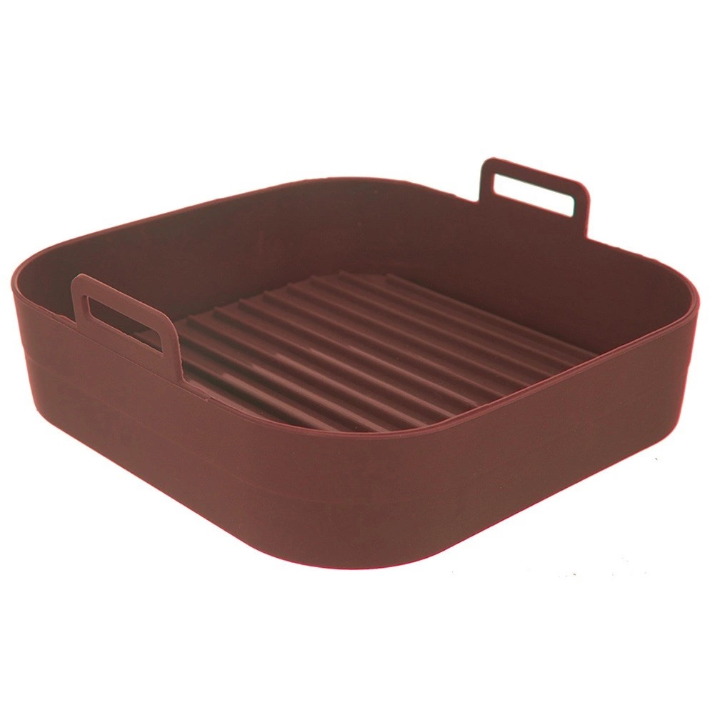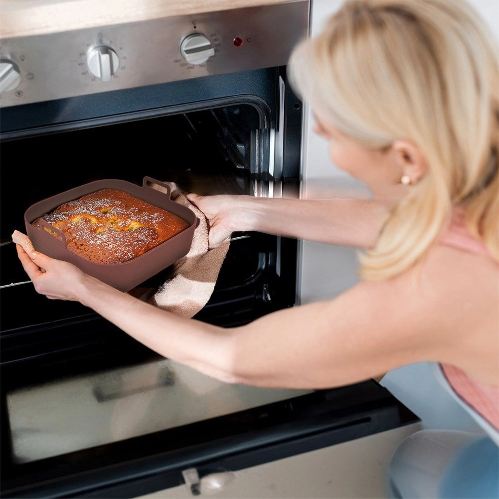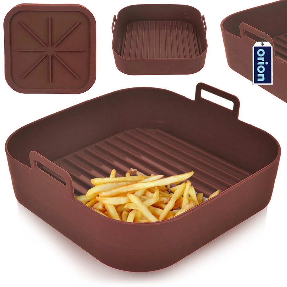 Ta kvadratna silikonska košara za vročezračni cvrtnik je idealna za vsakodnevno pripravo jedi brez nepotrebne umazanije. Neprijemljiva površina zagotavlja enostavno odstranjevanje jedi in hitro čiščenje, zvišani robovi in praktični ročaji pa povečajo varnost pri rokovanju.