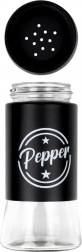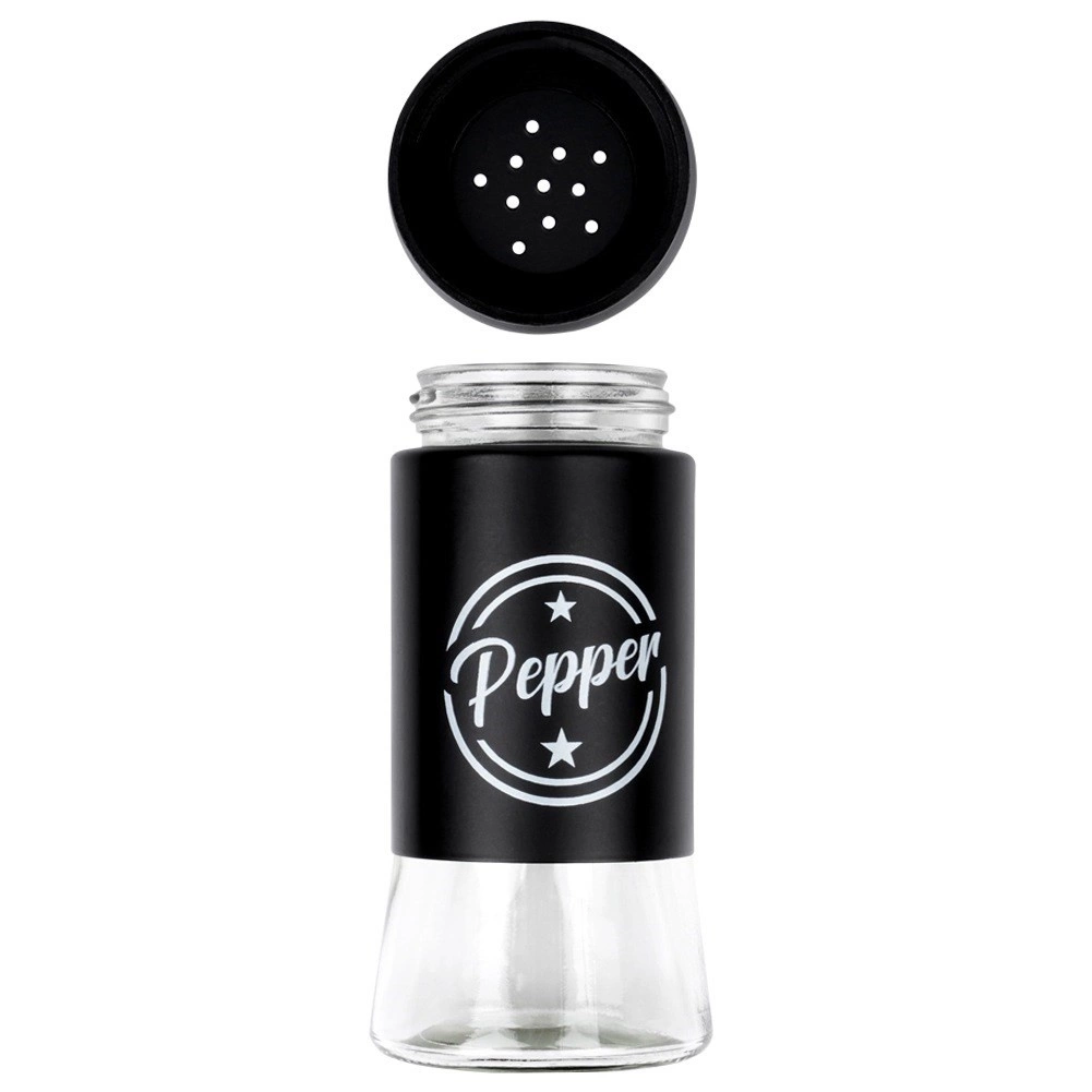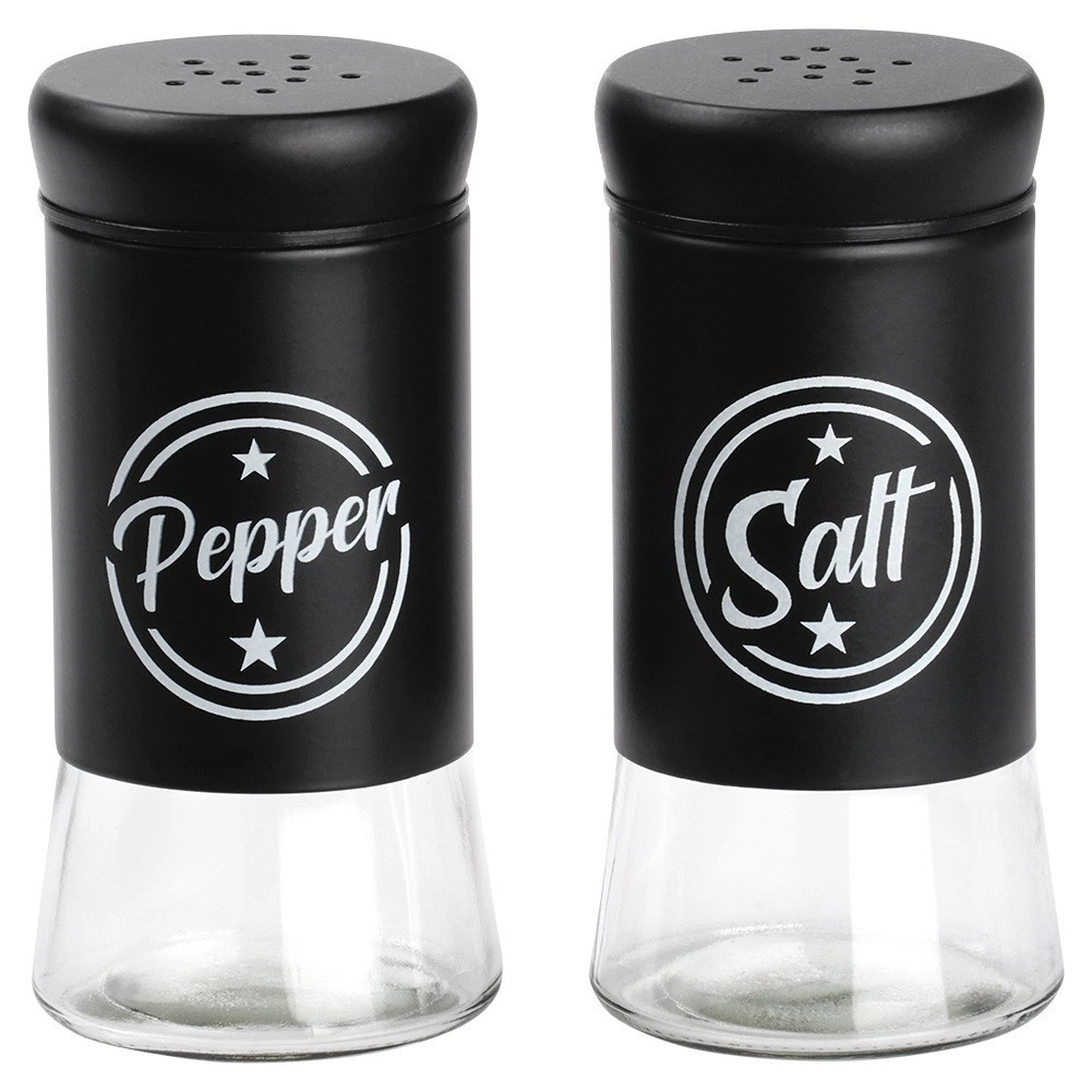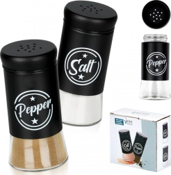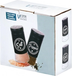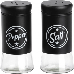 Komplet vsebuje dve posodici s prostornino 140 ml s prozornim steklenim spodnjim delom in mat črnim kovinskim zgornjim delom. Praktični pokrovčki z odprtinami omogočajo enakomerno posipanje in pomagajo ohraniti svežino in aromo začimb dalj časa. Zahvaljujoč jasnim napisom Salt in Pepper vedno hitro prepoznate pravo posodico.
