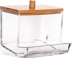 Ta eleganten dozator za vatirane palčke združuje čisti akril za popolno vidnost vsebine in naravni bambus za topel, moderen videz. Sprednja odprtina omogoča udobno izvlečenje posamezne palčke, pokrov z gumbom pa ohranja vsebino higiensko čisto in brez prahu.