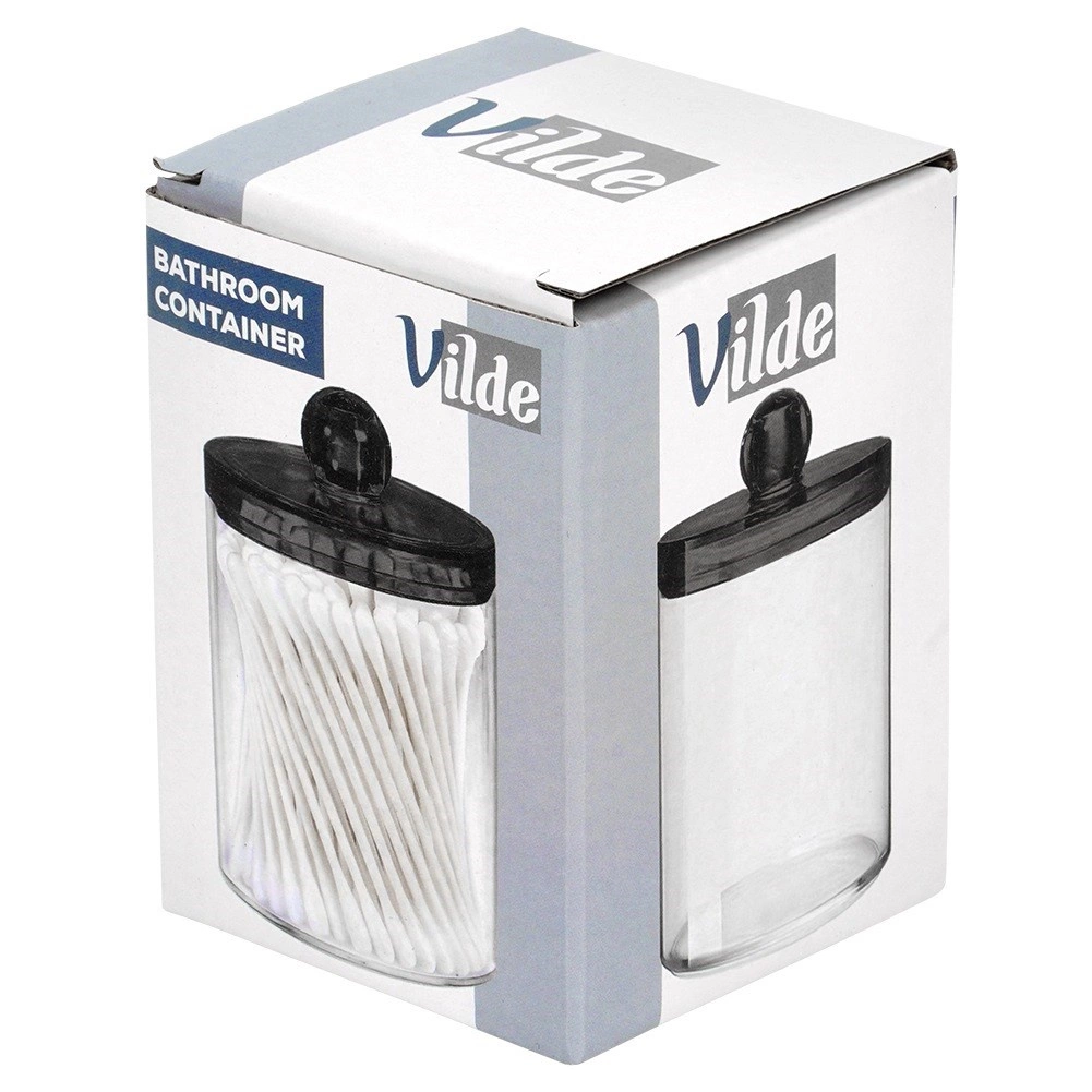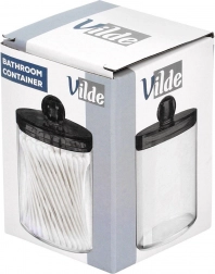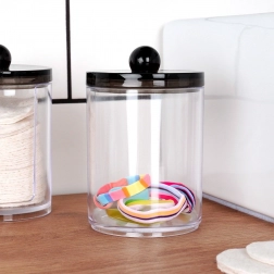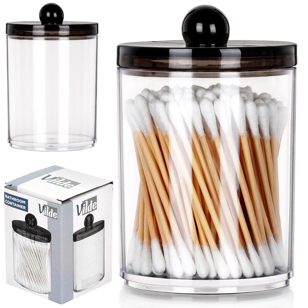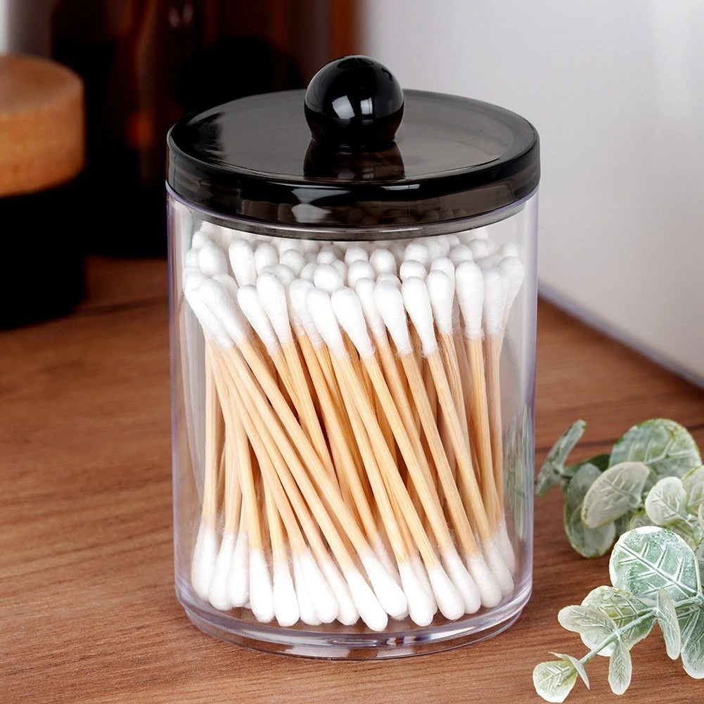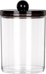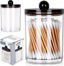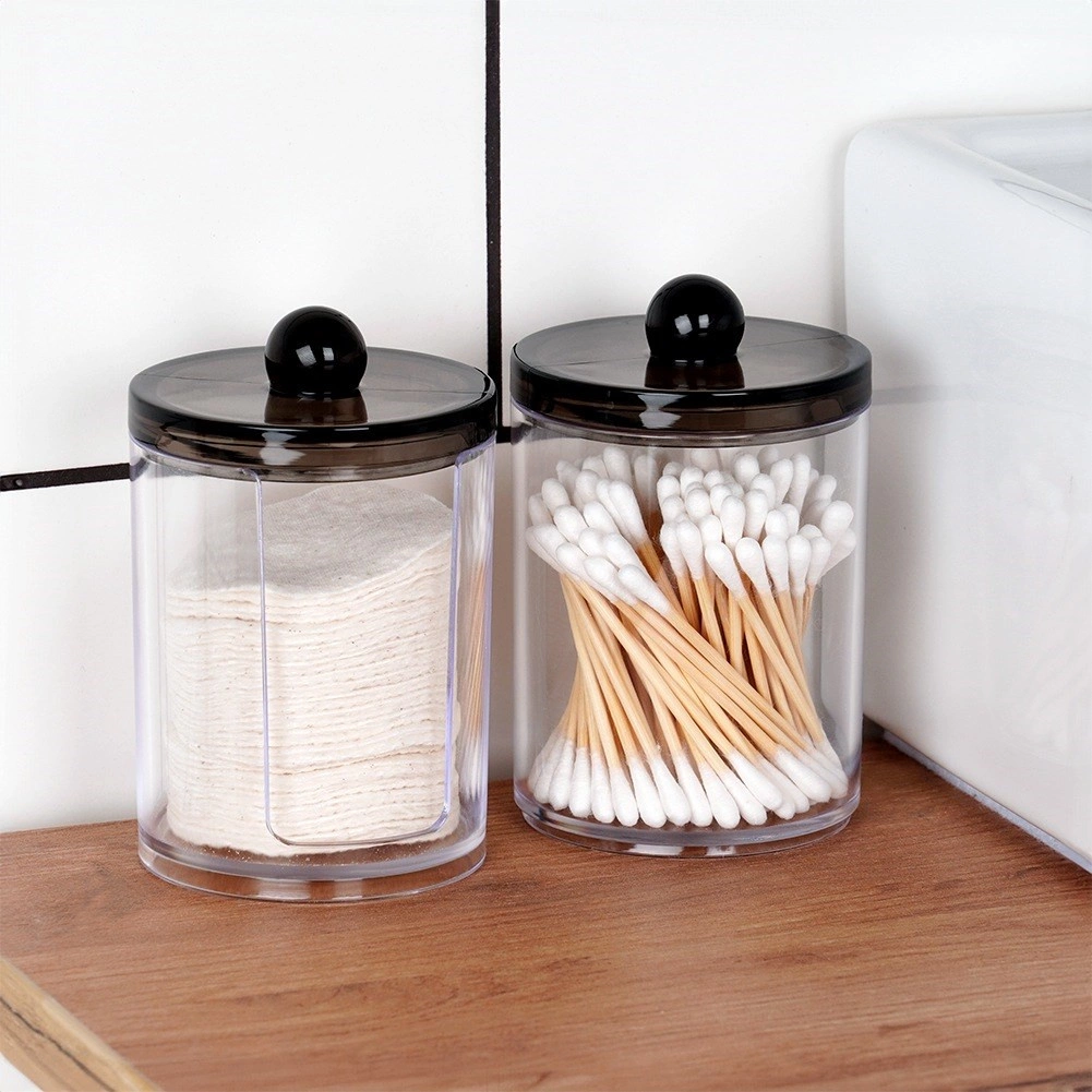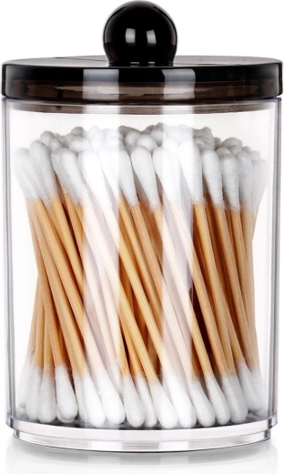 Ohranite kozmetične drobnarije pregledno na enem mestu. Ta prosojen akrilni dozirnik je idealen za vatirane palčke ali kozmetične blazinice. Minimalističen dizajn s črnim pokrovom se poda vsaki sodobni kopalnici in hkrati ščiti vsebino pred prahom.