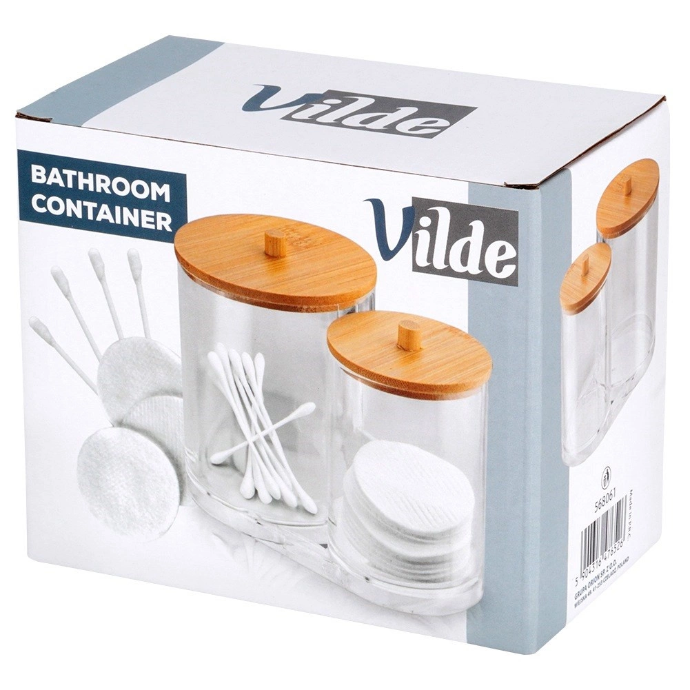 Elegantna in funkcionalna rešitev za vsakodnevno kopalniško rutino. Dva povezana vsebnika iz trpežnega prozornega akrila zagotavljata ločen prostor za vatirane palčke in blazinice za odstranjevanje ličil, zato vse ostane čisto, dostopno in lepo organizirano. Bambusovi pokrovi s praktičnimi ročaji ščitijo vsebino pred prahom in dodajo naraven, moderen videz.