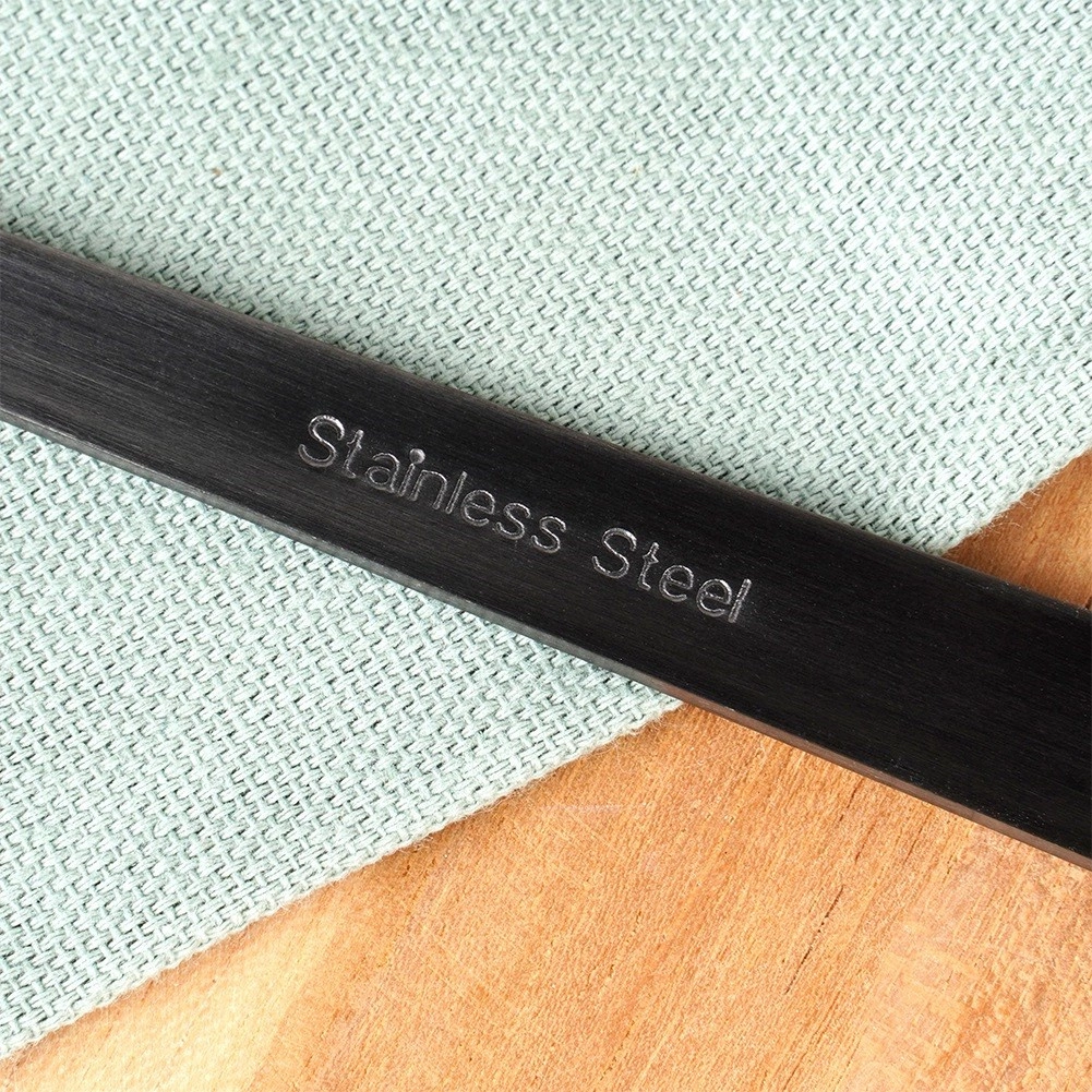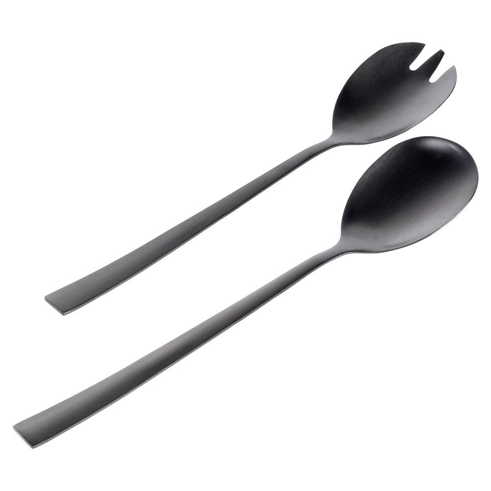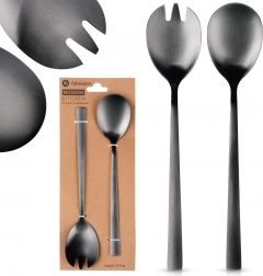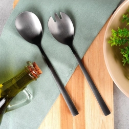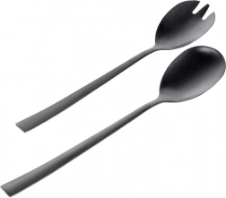 Komplet dveh servirnih žlic za solato je izdelan iz trpežnega nerjavnega jekla v črni barvi z nežnim satenastim učinkom. Ponuja popolno ravnovesje med sodobnim videzom in praktično uporabo – idealno za globlje sklede in solatnike.