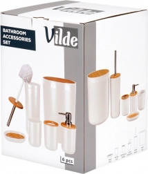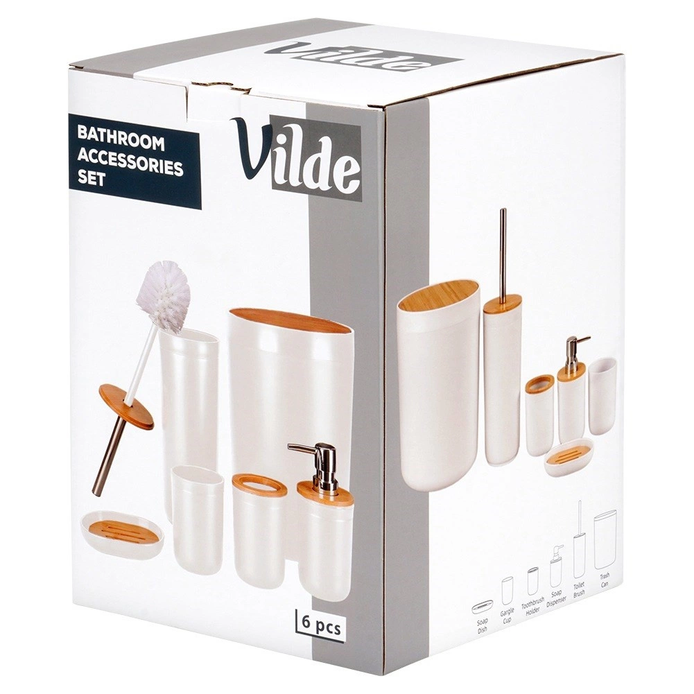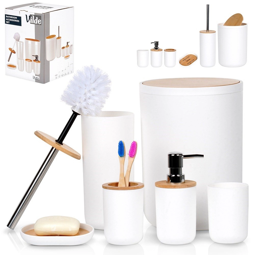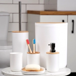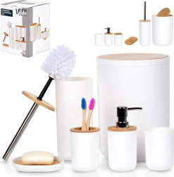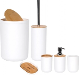 Set poenoti videz kopalnice in zagotavlja vse potrebno: dozirnik, posodico za milo, držalo za ščetke, kozarček, WC ščetko in koš za odpadke. Minimalističen bel dizajn z bambusom deluje toplo in čisto.
