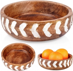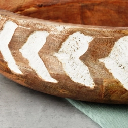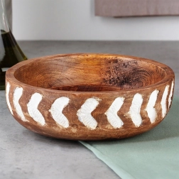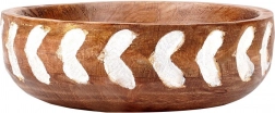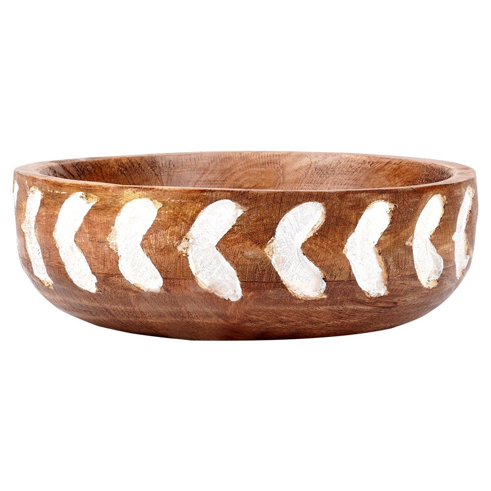 Ta skleda iz kakovostnega mangovega lesa lepo dopolni vašo mizo in interier. Širok in plitev profil olajša serviranje solat, sadja, oreščkov in drobnih prigrizkov. Ročno poslikan in izrezljan bel vzorec na zunanjem robu poudari naravno strukturo lesa in skledi daje edinstven, rustikalen značaj.