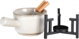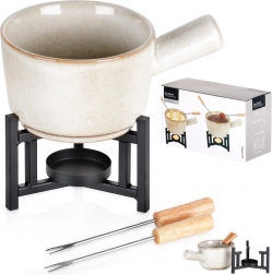 Ta kompaktni set za fondi združuje kakovosten porcelan v nežnem bež tonu z vzdržljivim kovinskim stojalom v mat črni barvi. Skleda se hitro segreje in dolgo ohranja temperaturo, zato lahko uživate v stopljeni čokoladi, sirih in drugih toplih omakah točno tako, kot imate radi.
