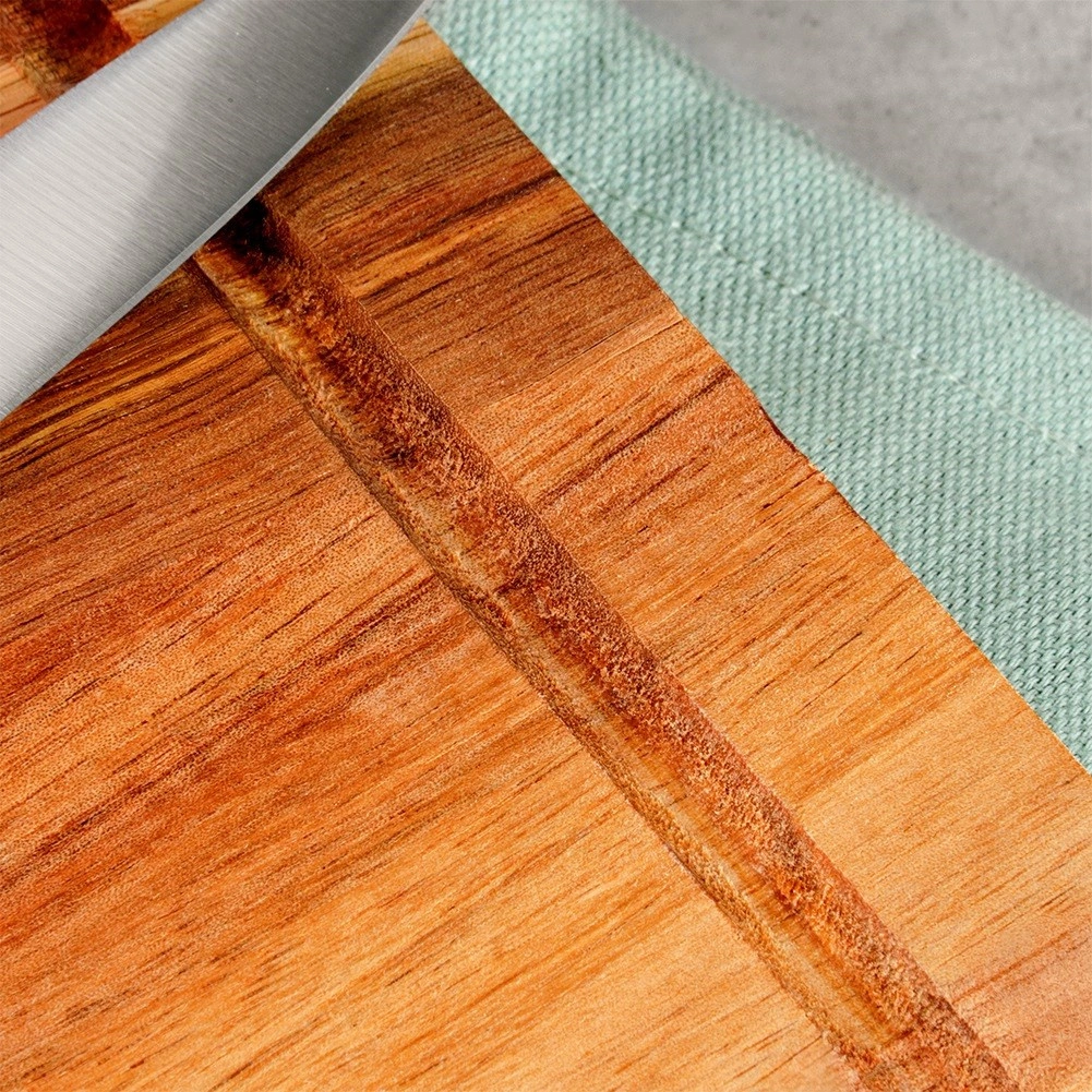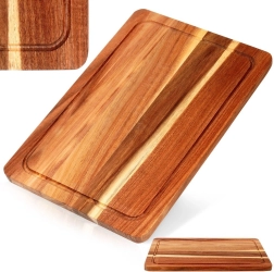 Praktična in stilska deska iz kakovostnega akacijevega lesa izstopa po naravni strukturi in trdnosti. Globok odkapni utor po celotnem obodu zanesljivo zadržuje tekočine in preprečuje njihov odtok na delovno površino. Deska je primerna za rezanje mesa, zelenjave in sadja ter služi tudi kot eleganten servirni pladenj za sire, narezke ali prigrizke.