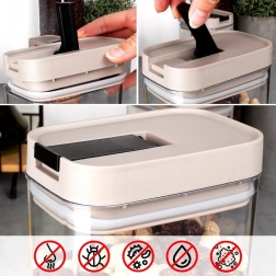 Ročični mehanizem z gumijastim tesnilom preprečuje dostop zraka in vlage, kar ohranja živila hrustljava, dišeča in zaščitena pred škodljivci.