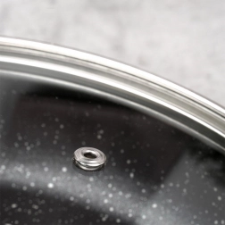 Robustna nerjavna obroba zagotavlja dolgo življenjsko dobo in tesno prileganje na rob posode. Ergonomski gumb z imitacijo lesa je prijeten na dotik in varen pri uporabi. Vgrajena odzračevalna odprtina zanesljivo odvaja odvečno paro, rahlo izbočena oblika pa spodbuja kroženje vročega zraka.
