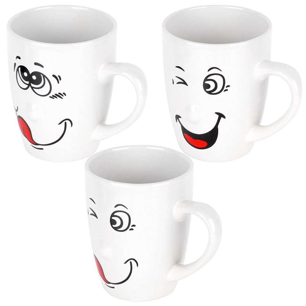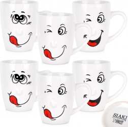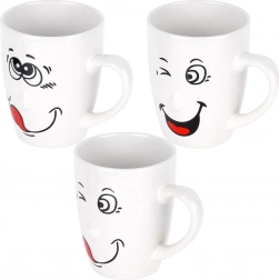V svoj dom prinesite igrivo razpoloženje. Ta komplet 6 skodelic iz kakovostne bele keramike navduši z veselimi motivi obrazov, ki vsakemu požirku kave ali čaja dodajo ščepec dobre volje. Skodelice imajo udobno C‑ušeso, prijetno ležijo v roki in se zahvaljujoč gladki glazirani površini preprosto čistijo.