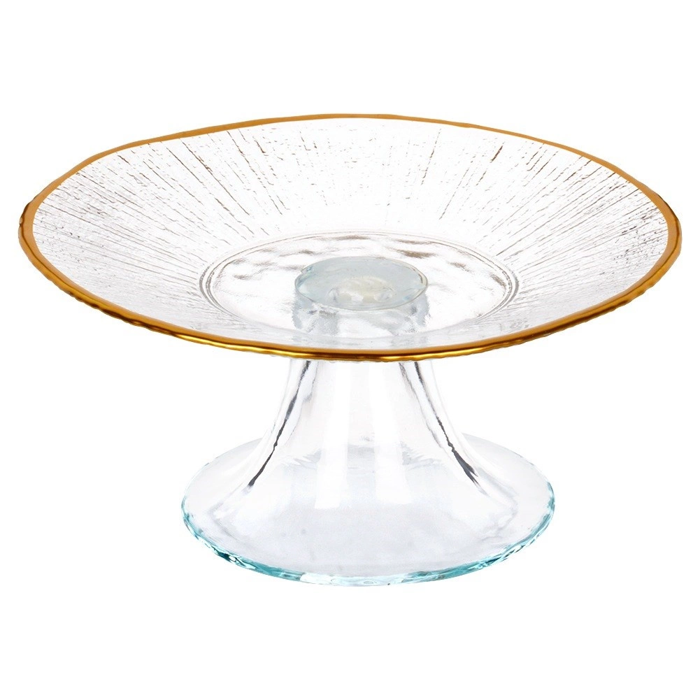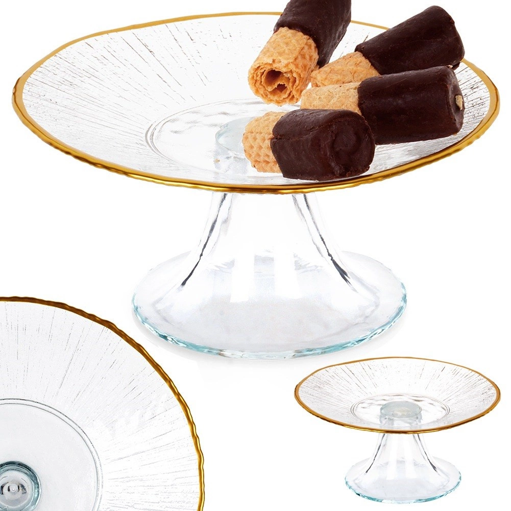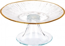 Ta kompaktna steklena patera s premerom 15,5 cm in višino 7 cm je odlična izbira za serviranje manjših porcij – mono tortic, cupcakov, piškotov ali slanih prigrizkov. Prosojno steklo z nežno teksturo, ki spominja na kristal, poudari barve in strukture postreženih specialitet, medtem ko z zlatom obrobljen rob doda pridih razkošja.