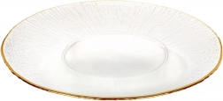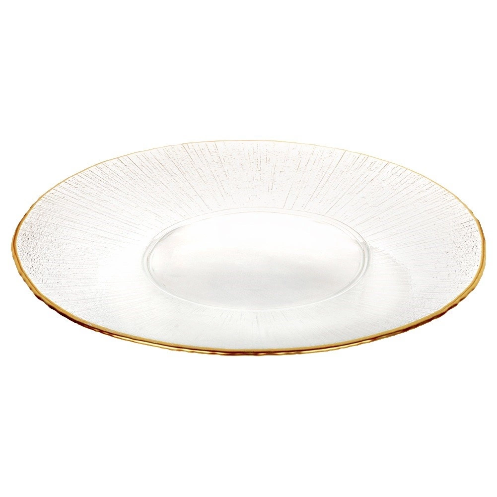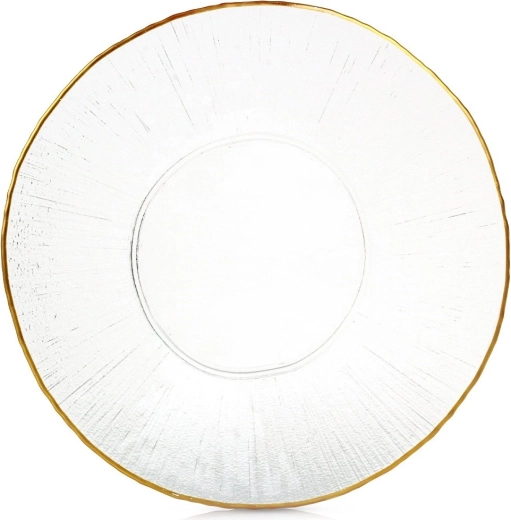 Ta univerzalni steklen krožnik s premerom 30 cm izstopa z dekorativnim pozlačenim robom in radialno strukturo, ki poudarja moderen in razkošen slog pogrinjanja. Idealen je za vsakodnevno uporabo in slavnostne priložnosti, kjer odlično služi za serviranje glavnih jedi, sladic ali kot estetska patera.