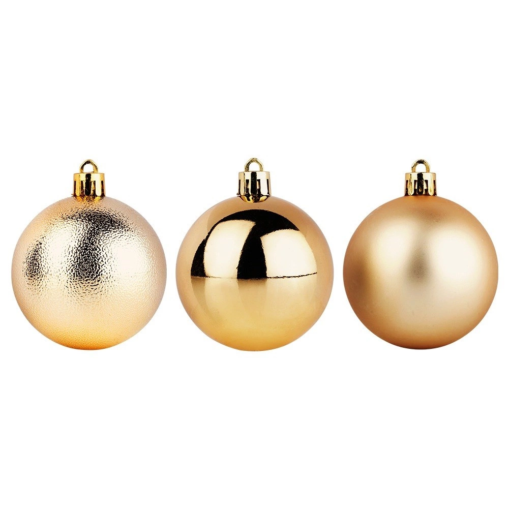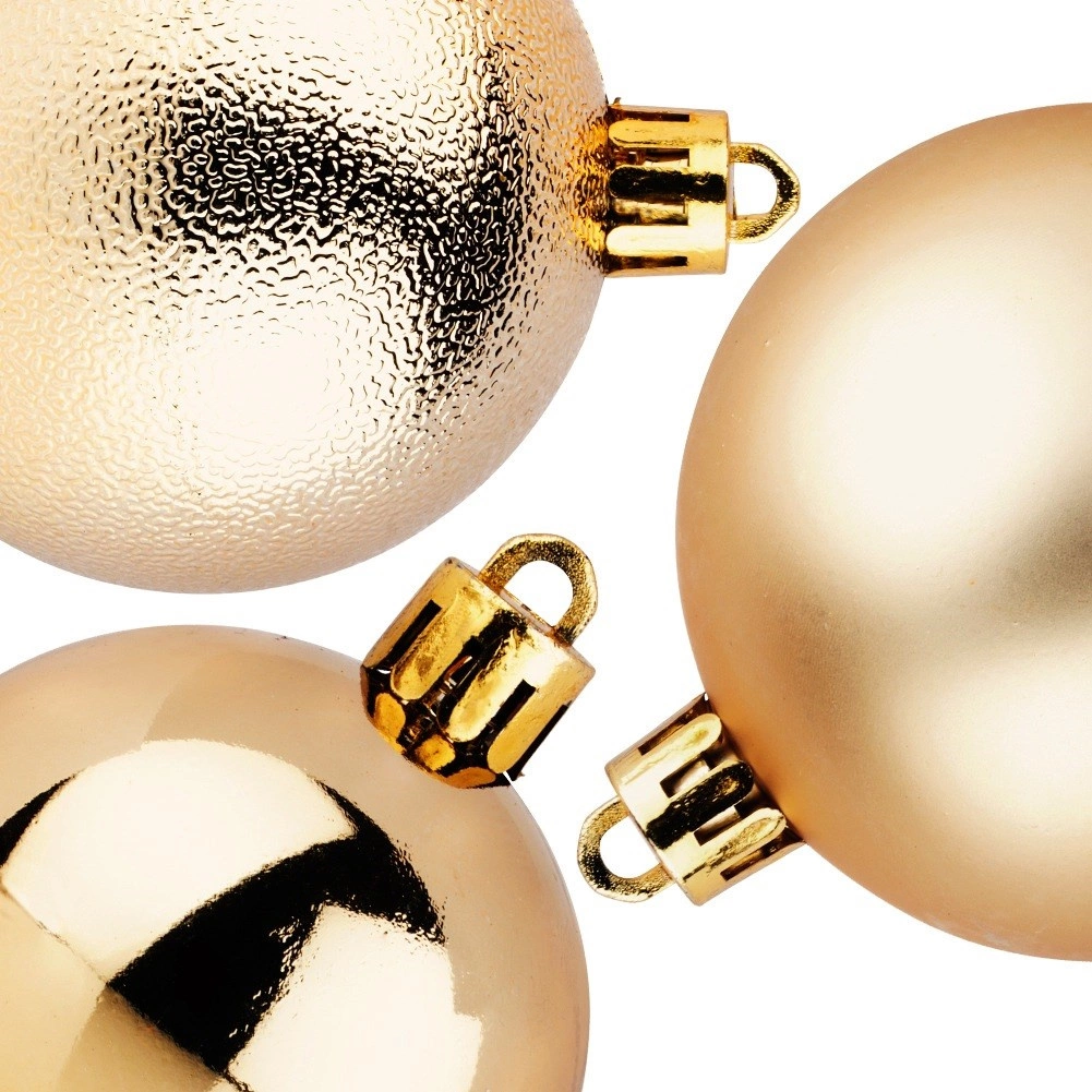 Bleščeče, mat in strukturirane krogle v istem zlatem tonu ustvarjajo harmoničen in hkrati izrazit videz praznične dekoracije.
