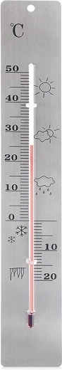 Termometer je napolnjen z naftno tekočino in ne vsebuje živega srebra, zato je varen za gospodinjstvo. Zaradi praktičnega očesa za obešanje ga zlahka namestite na steno na balkonu, terasi, na vrtu ali v stanovanju.