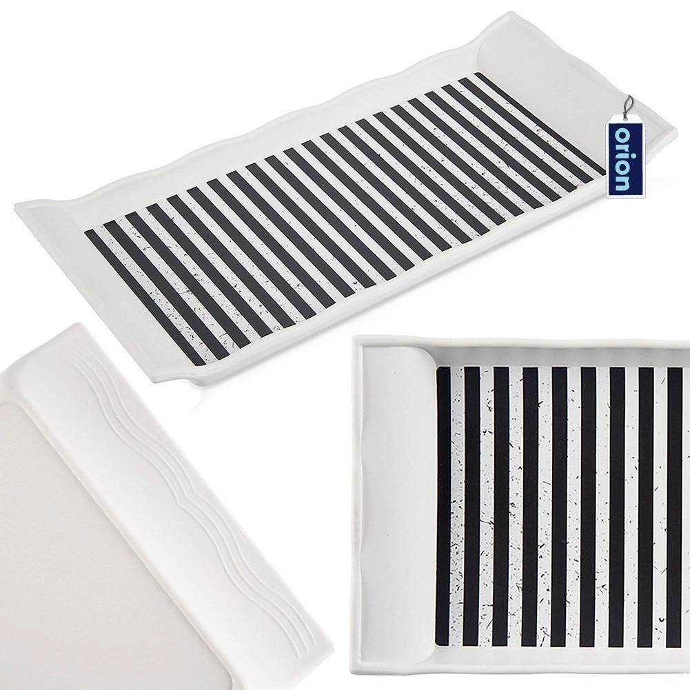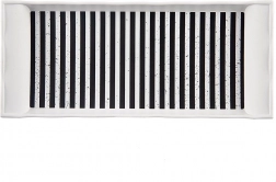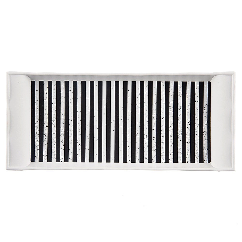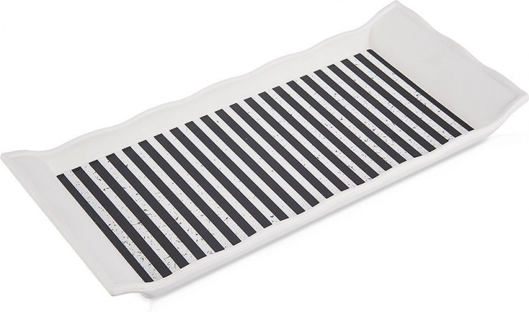 Slogoven in praktičen servirni pladenj s kontrastnimi črno-belimi črtami zanesljivo drži skodelice, kozarce in krožnike na mestu. Visoki robovi olajšajo varno prenašanje, gladka površina pa omogoča hitro in enostavno čiščenje. Odlično se poda za kavo, čaj, slaščice in drobne prigrizke.