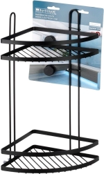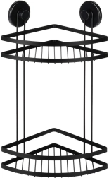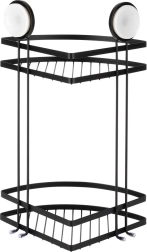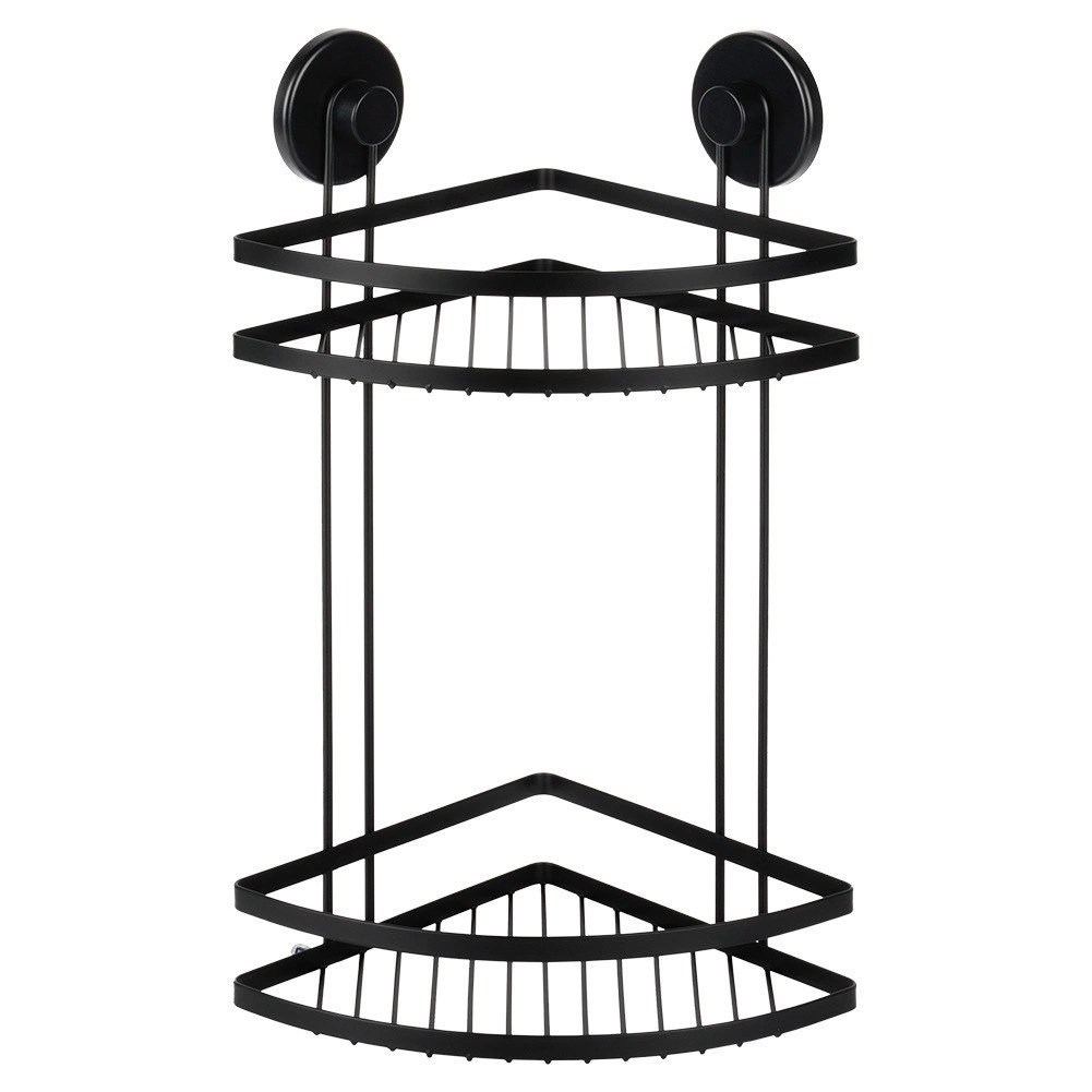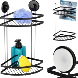 Praktičen kotni kopalniški regal z dvema nivojema in montažo s priseski ohranja vašo kozmetiko vedno pri roki. Trpežna kovinska konstrukcija v mat črni barvi, brez vrtanja, enostavna namestitev in nosilnost do 3,5 kg ga delajo idealno rešitev za organizacijo kopalnice.