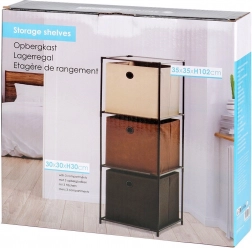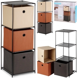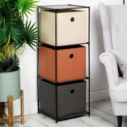 To ozko stojalo z dimenzijami 34,5 × 34,5 × 100 cm združuje trpežen črn kovinski okvir in tri tekstilne škatle v barvah bež, rjava in antracit. Vsaka škatla ima kovinsko očesce za enostavno upravljanje in je zložljiva, zato v času neuporabe ne zavzema prostora. Idealna rešitev za pregledno razvrščanje in shranjevanje.