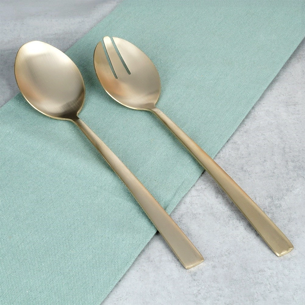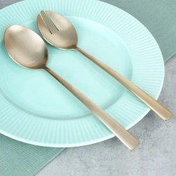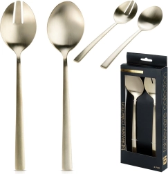 Elegantni set dveh servirnih žlic za solato dolžine 25 cm v moderni zlati barvi s satenskim zaključkom. Izdelane iz kakovostnega nerjavečega jekla, odlične za mešanje in serviranje solat ter drugih jedi. Praktične, trpežne in primerne za pomivalni stroj – idealne za vsakodnevno uporabo in slavnostne priložnosti.