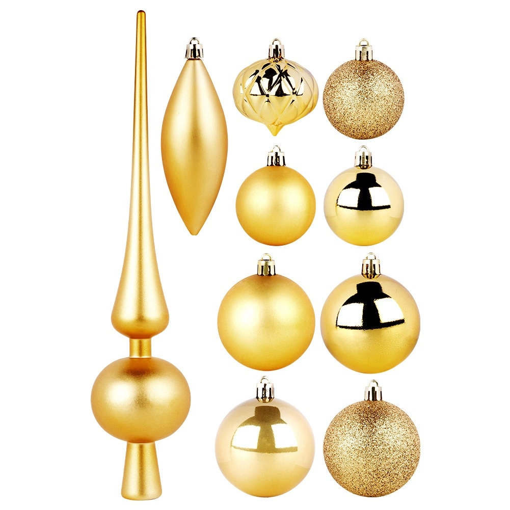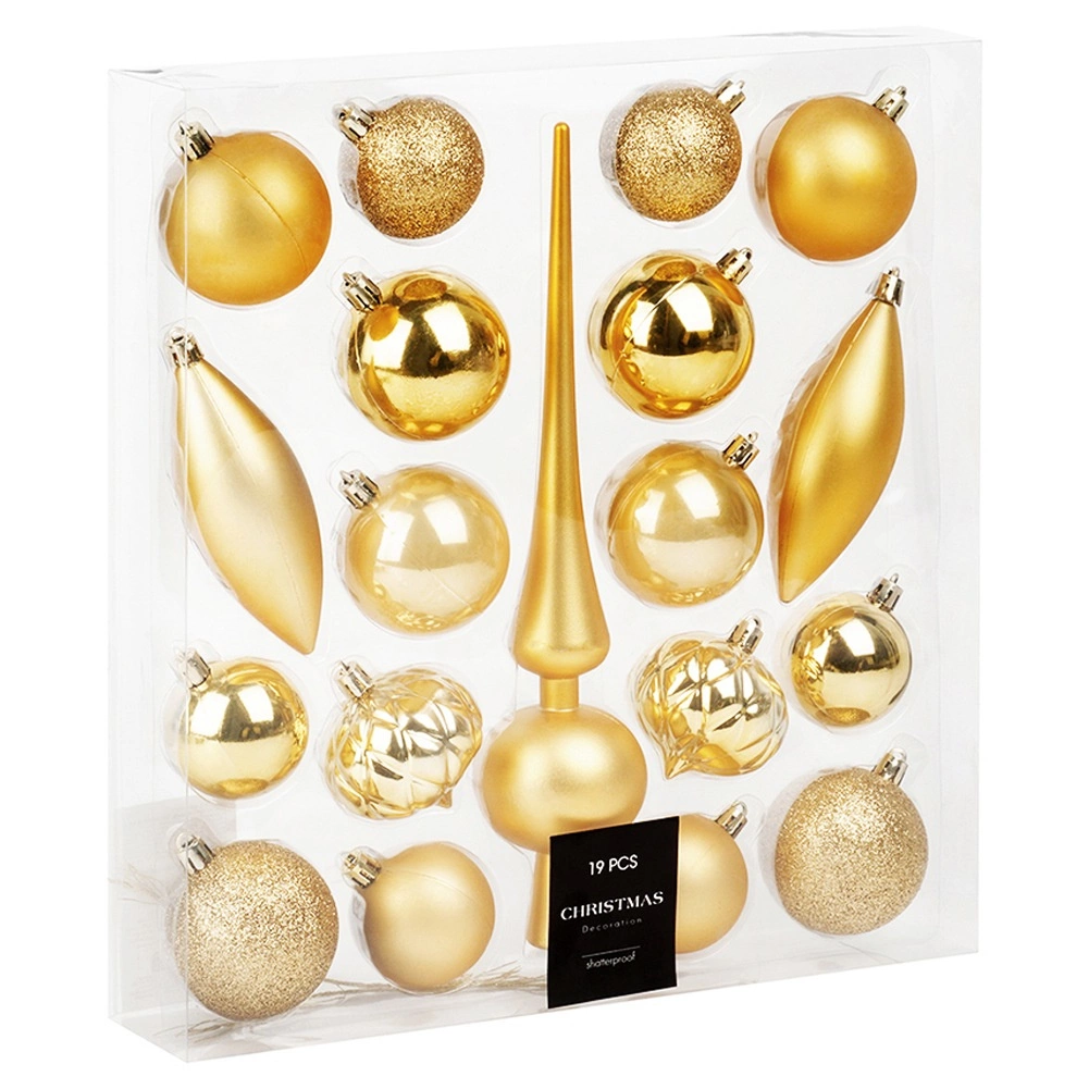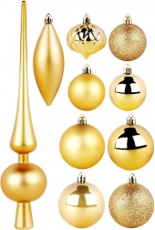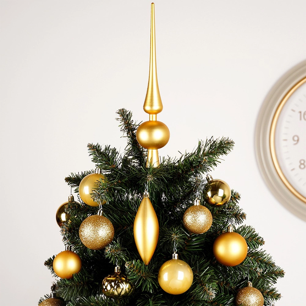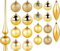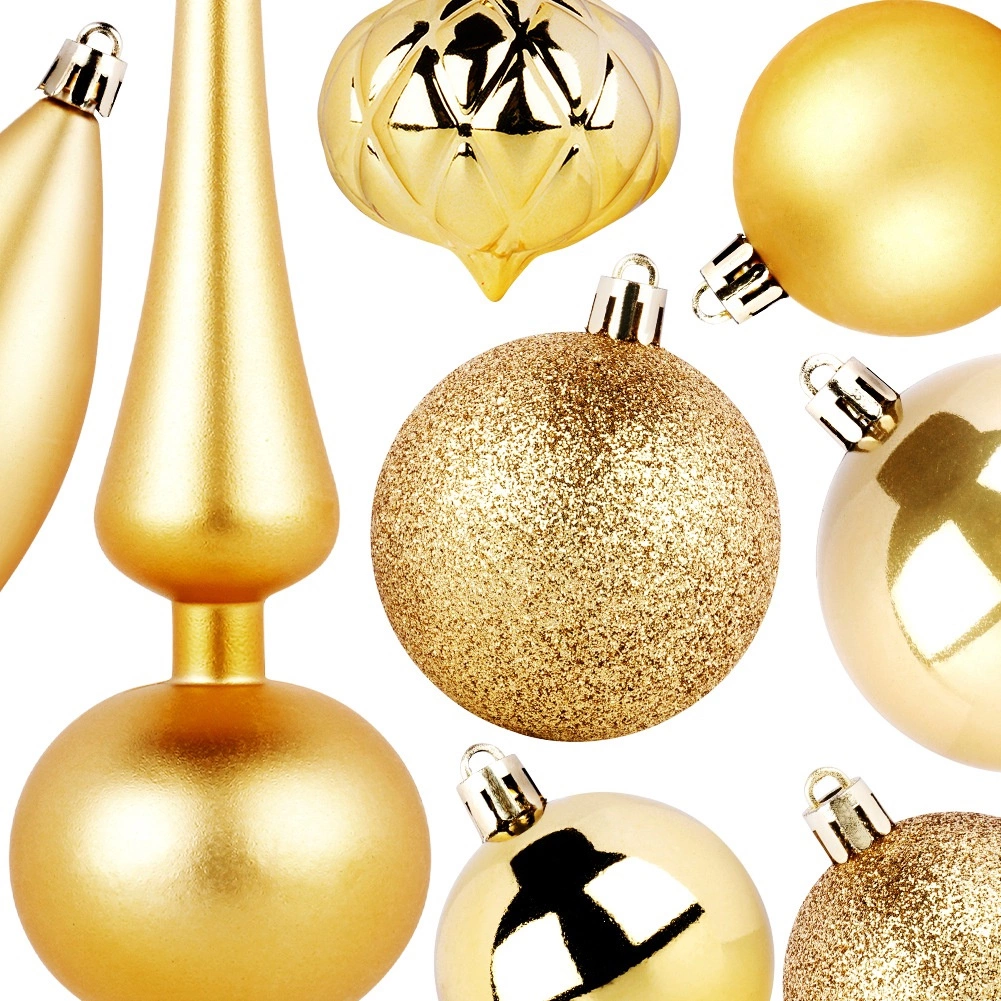 Ta vsestranski komplet 19 zlatih okraskov združuje različne oblike in površinske obdelave za bogat in uravnotežen videz drevesa. V njem najdete mat, sijajne, biserne in bleščeče krogle, elegantno špico ter dvojico kapljičastih “soplov”. Lahek in trpežen material zagotavlja zanesljivost in dolgo življenjsko dobo brez tveganja razbitja.