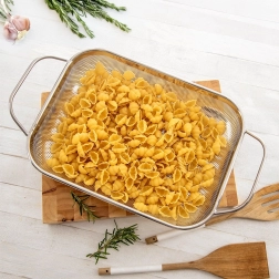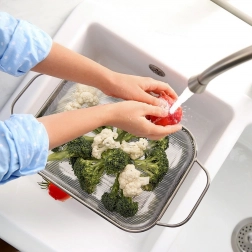 Drobna mrežica učinkovito odvaja vodo in hkrati zadrži tudi majhne koščke živil – idealno za zelenjavo, testenine ali riž.