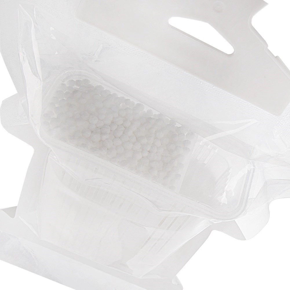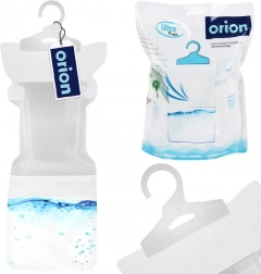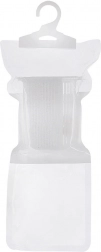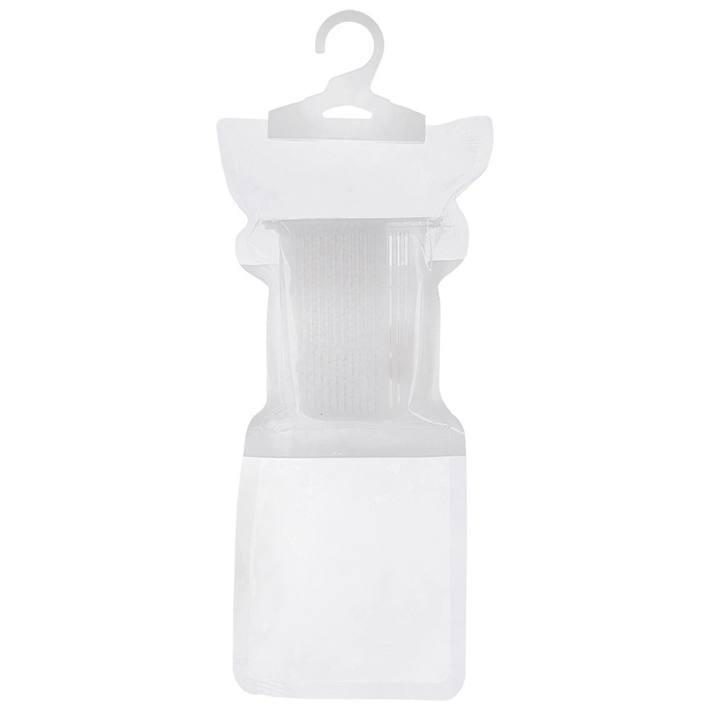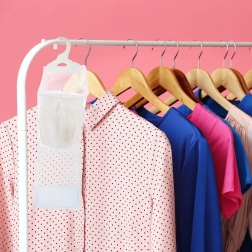 Zahvaljujoč praktični kljukici ga enostavno obesite na obešalno palico ali stensko kljuko. Absorpcijski granulat CaCl₂ veže vlago iz zraka in jo pretvarja v vodo, ki se zbira v spodnjem delu vrečke. Ko je napolnjena, je izdelek namenjen zamenjavi.