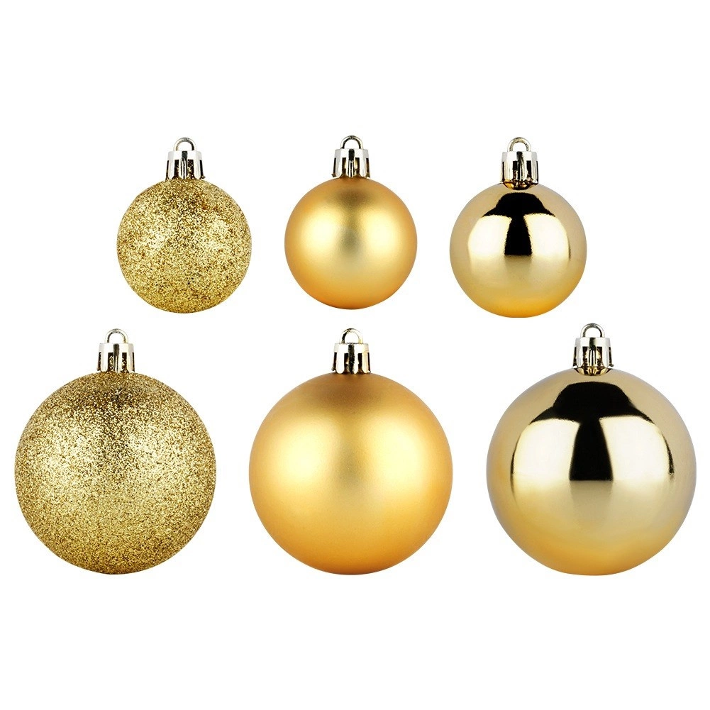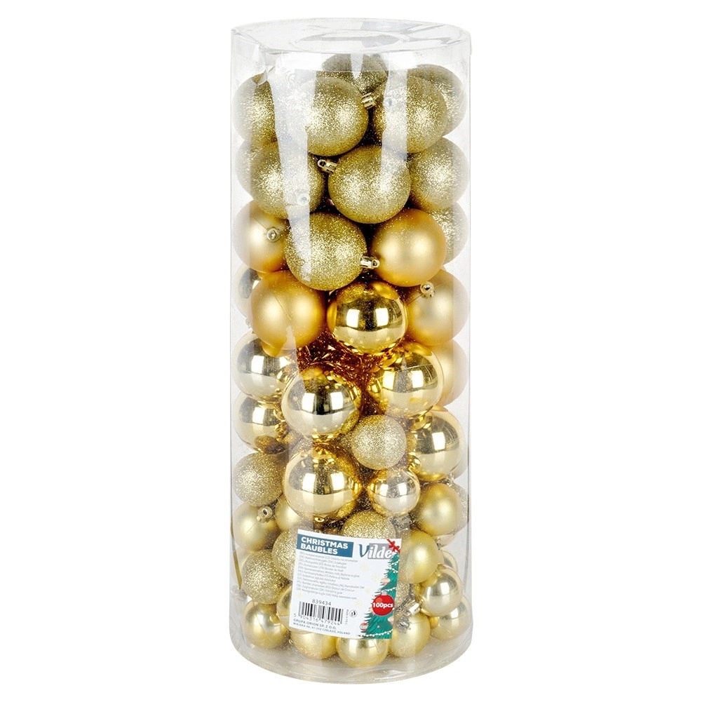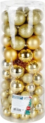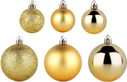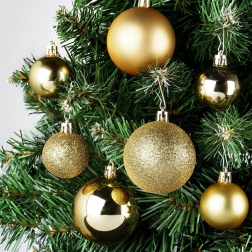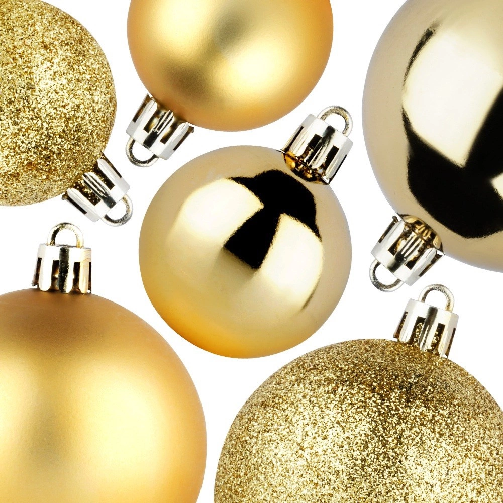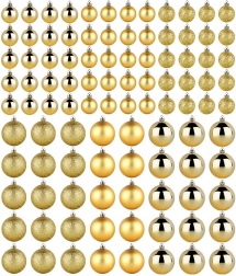 Ustvarite doma čarobno vzdušje s kompletom 100 zlatih okraskov, ki kombinira mat, sijajne in bleščeče površine. Nezlomljiva izvedba iz kakovostne plastike zagotavlja varnost in vzdržljivost, hkrati pa po videzu zvesto spominja na steklo. Zahvaljujoč dvema velikostma, 4 in 6 cm, zlahka dosežete bogat in uravnotežen videz božičnega drevesca.