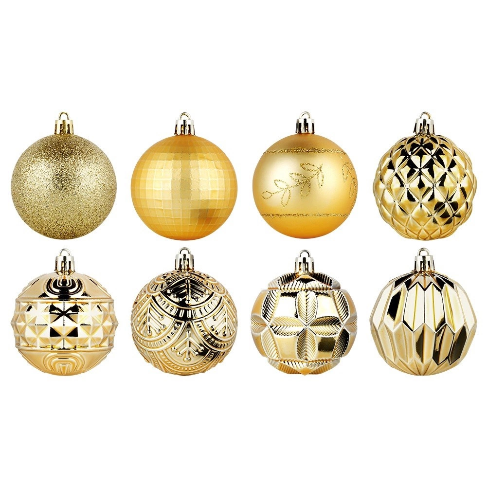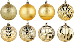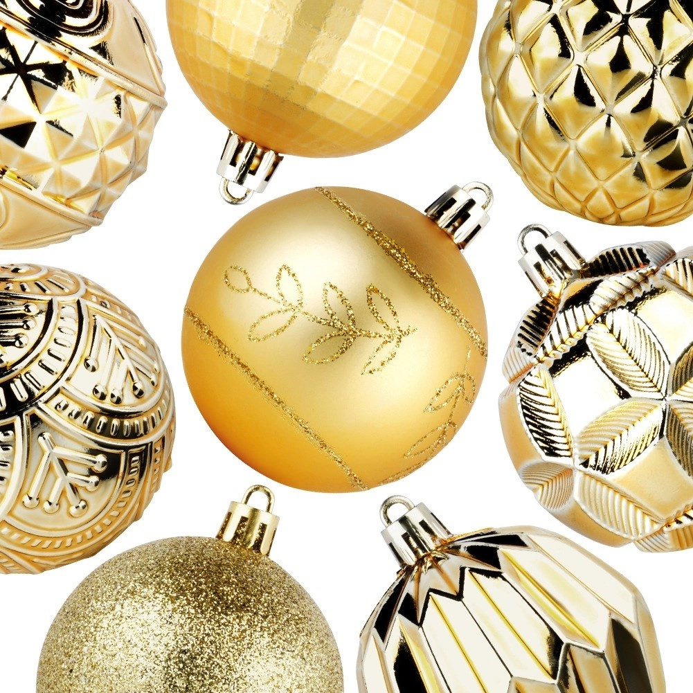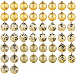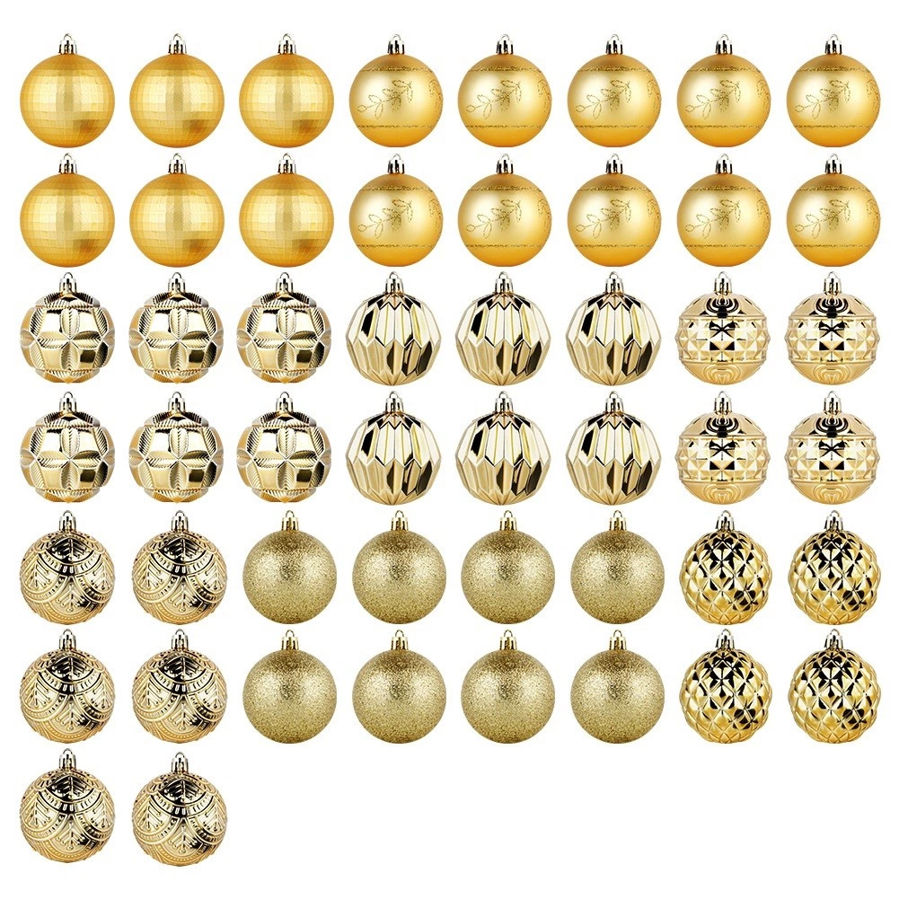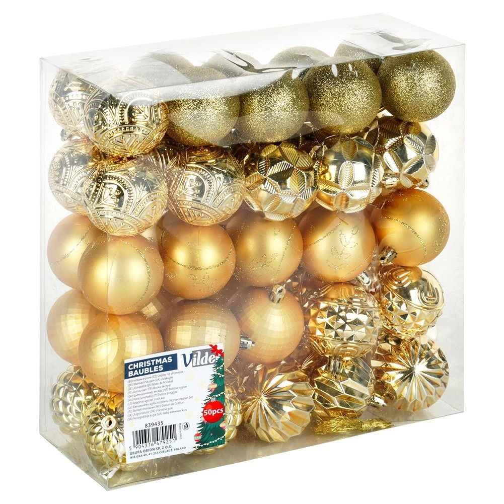 Ustvarite čarobno božično dekoracijo z bogatim kompletom 50 kosov v enotnem zlatem tonu. Okraski delujejo razkošno, različne teksture in dekorji pa drevesu in aranžmajem dodajo globino in iskrivost. Izdelani so iz odpornega materiala, ki spominja na steklo, vendar je varnejši in trpežnejši.