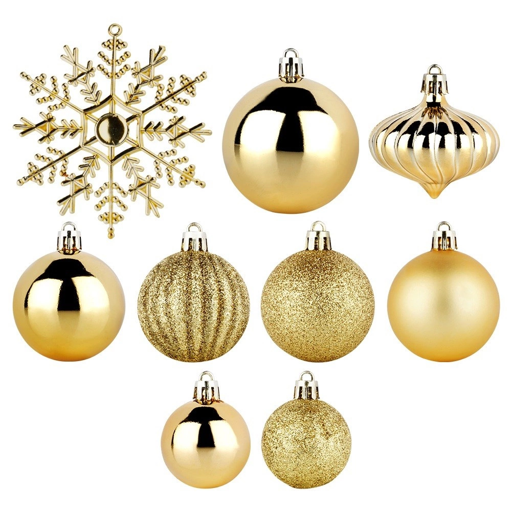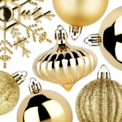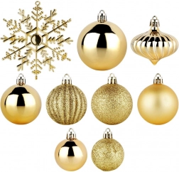 Svetleče, mat, bleščeče in reliefne krogle v enotni zlati barvi ustvarjajo harmonično, a vizualno bogato okrasitev.