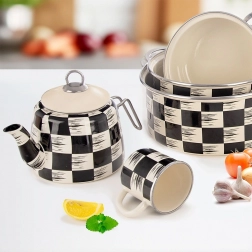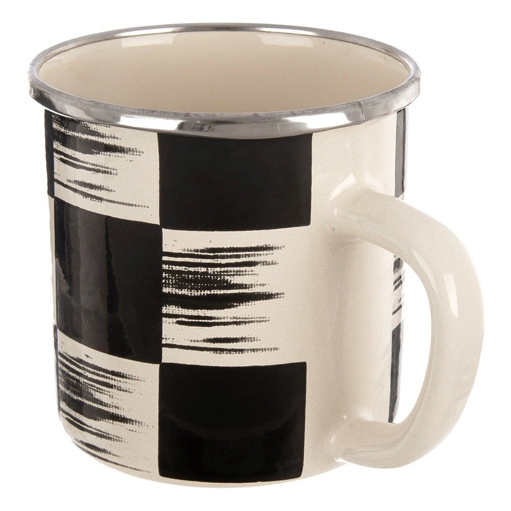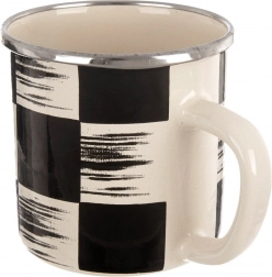 Emajliran lonček Šahovnica združuje brezčasen retro videz s sodobno funkcionalnostjo. Največja prostornina 400 ml in mere 12 × 9 × 8,5 cm ga naredijo odličnega sopotnika za kavo, čaj ali kakav. Zunanjost z izrazito črno‑bež kostnico ter kremno notranjostjo, dopolnjena z nerjavnim robom, je ne le stilska, temveč tudi praktična in enostavna za čiščenje.