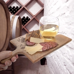 Deska je idealna za sire, mesnine, sadje in tapase. Ergonomsko ušce za enostavno prenašanje ter dekorativni graviran motiv vinske trte poudarjata njen eleganten videz na mizi.