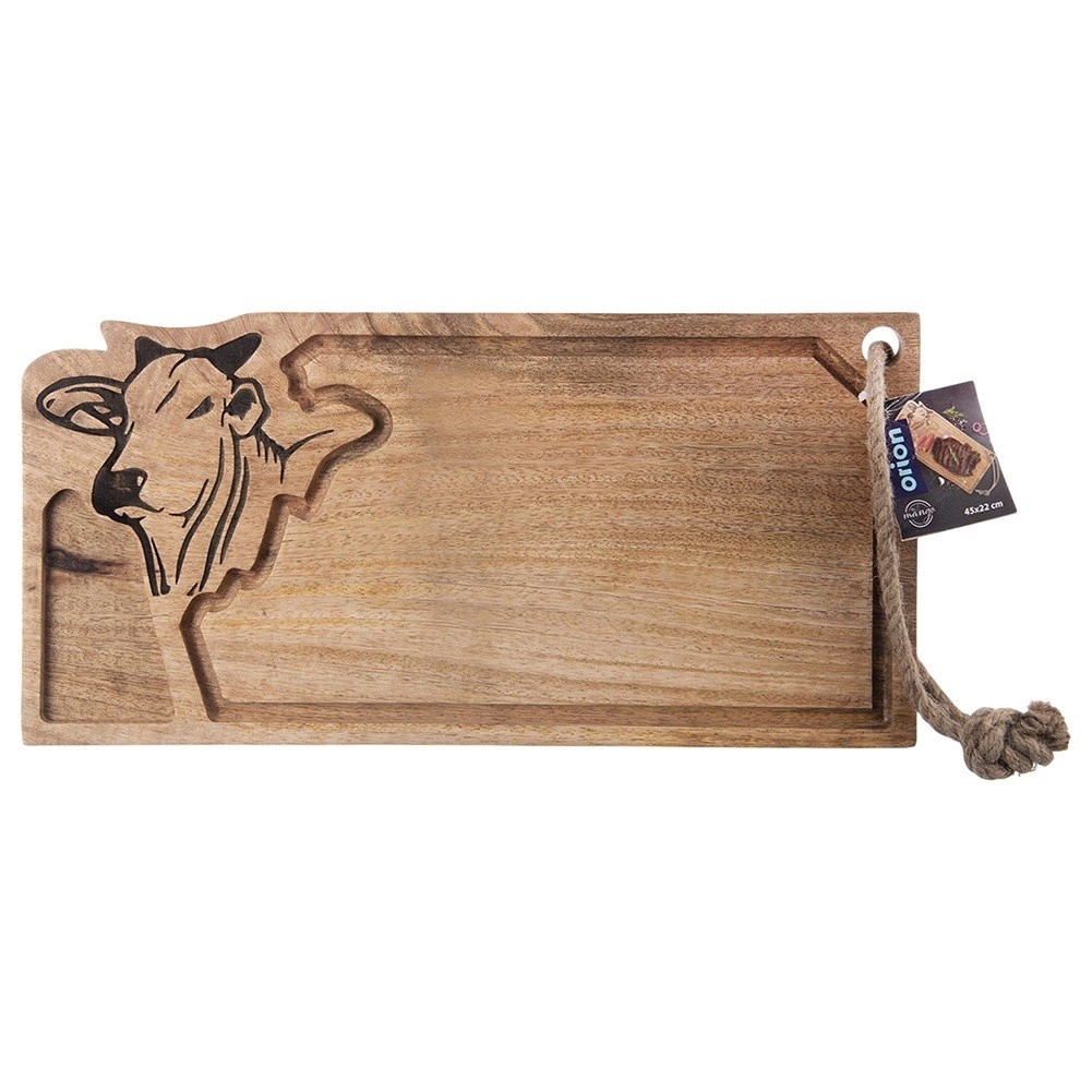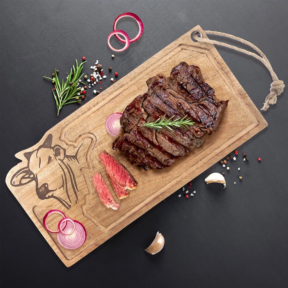 Odkrijte vsestransko leseno desko iz mangovega lesa, ki izstopa po trdnosti, naravni odpornosti in čudoviti teksturi. Zahvaljujoč praktičnemu kanalu za sokove ohranja delovno površino čisto pri rezanju mesa, sadja in zelenjave. Vgravirana bikova glava ter obešalna vrvica poudarjata njeno dekorativno in funkcionalno vrednost.
