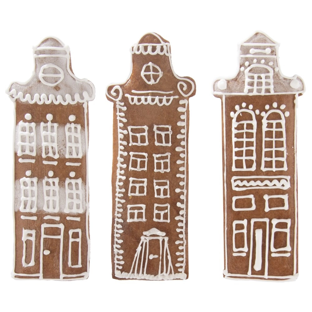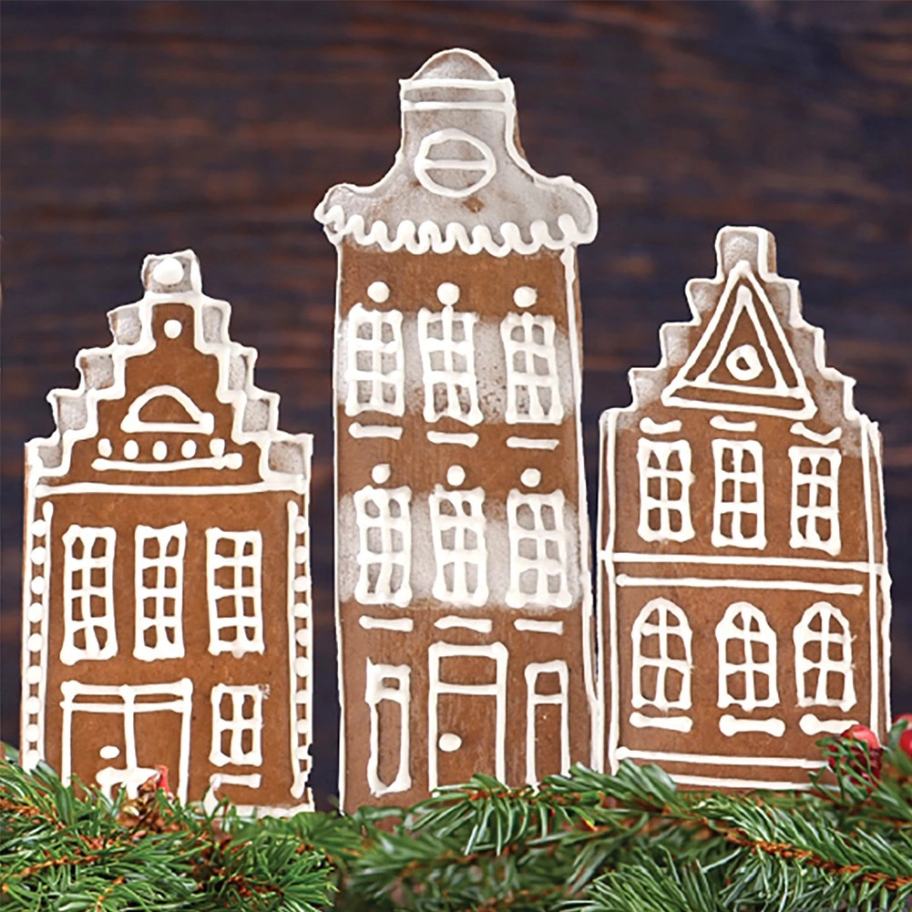 Silhueta »mestne« hiše z izrazito streho ustvari privlačne piškote in medenjake, idealne za praznično mizo in darilna pakiranja.