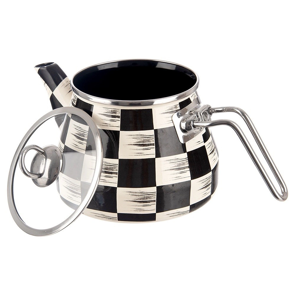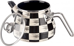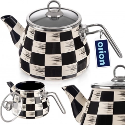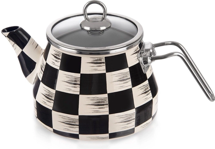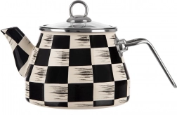 Odkrijte praktičen in brezčasen čajnik z vzorcem črno–bež šahovnice, ki bo krasil vašo kuhinjo. Emajlirana kovina zagotavlja dolgo življenjsko dobo, je higienična in primerna tudi za alergike. Steklen pokrov omogoča nadzor vrenja na prvi pogled, medtem ko nerjavni rob in kovinski ročaj čajniku dodajata stabilnost in stil.