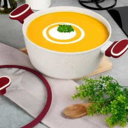 Idealen za juhe, dušenje in enolončnice. Stekleni pokrov z ventilom omogoča nadzor kuhanja, medtem ko mehki, toplotno odporni ročaji zagotavljajo varen oprijem. Lonec je zasnovan tako, da prenese nenadne temperaturne spremembe, obenem pa odlično izgleda tudi pri postrežbi neposredno na mizi.
