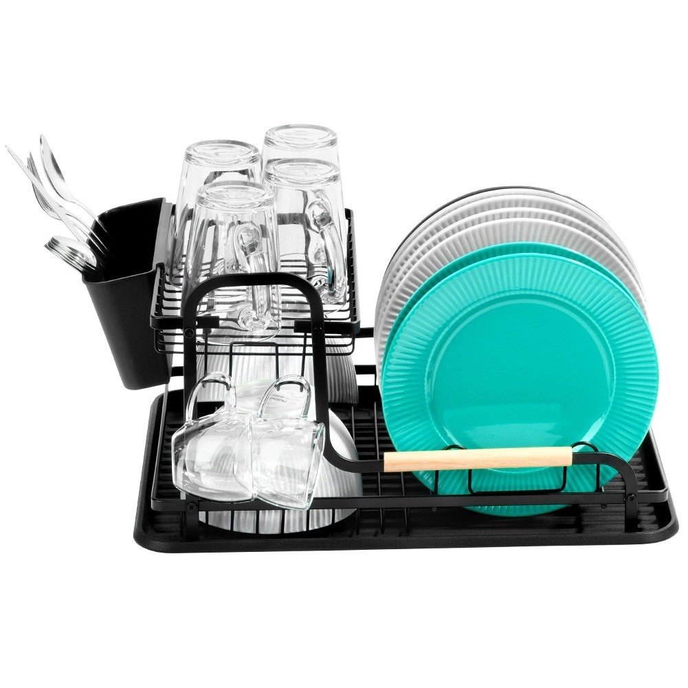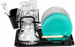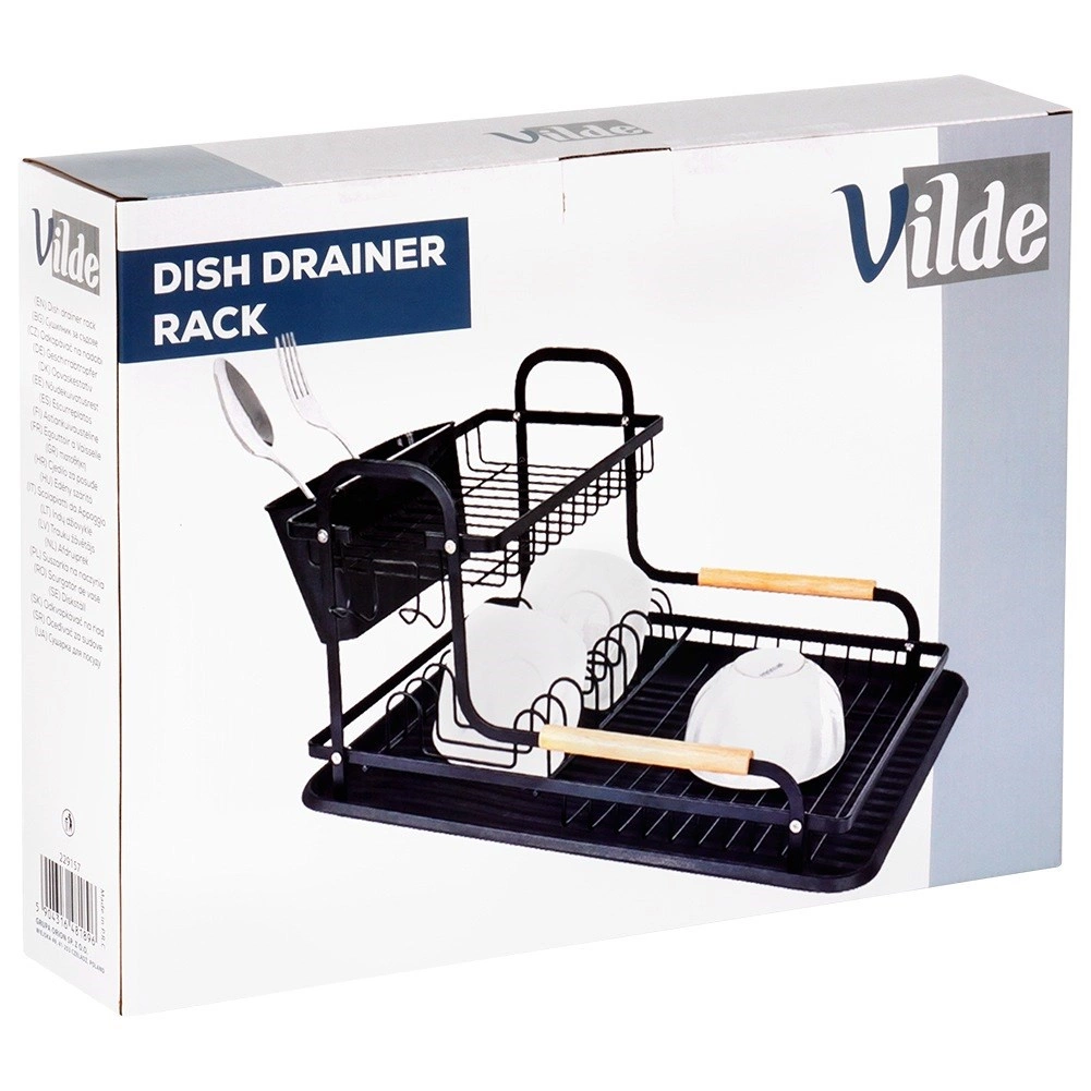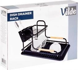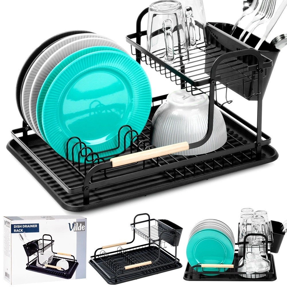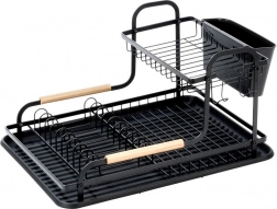 Robusten okvir iz odporne kovine v črni mat izvedbi dopolnjujejo elegantni leseni ročaji za enostavno prenašanje. Odstranljiv dvoprekatni košek za pribor pomaga ohranjati red in pospešuje sušenje. Odcejevalnik je enostaven za čiščenje in zasnovan za vsakodnevno udobje.