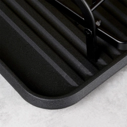 Trdna kovina v črni mat barvi, leseni ročaji za udobno prenašanje in odcejalni pladenj, ki ščiti delovno površino.