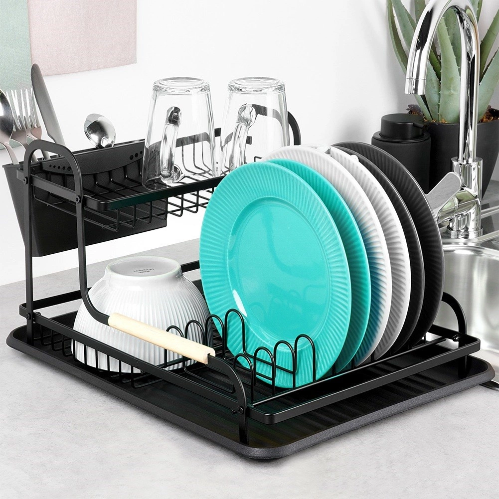 Maksimizirajte prostor ob pomivalnem koritu s tem dvonivojskim odcejevalnikom za posodo. Spodnja polica sprejme do 10 krožnikov, zgornji in spodnji del sta idealna za skodelice, kozarce in sklede. Vgrajen odcejalni pladenj ohranja delovno površino suho in čisto.