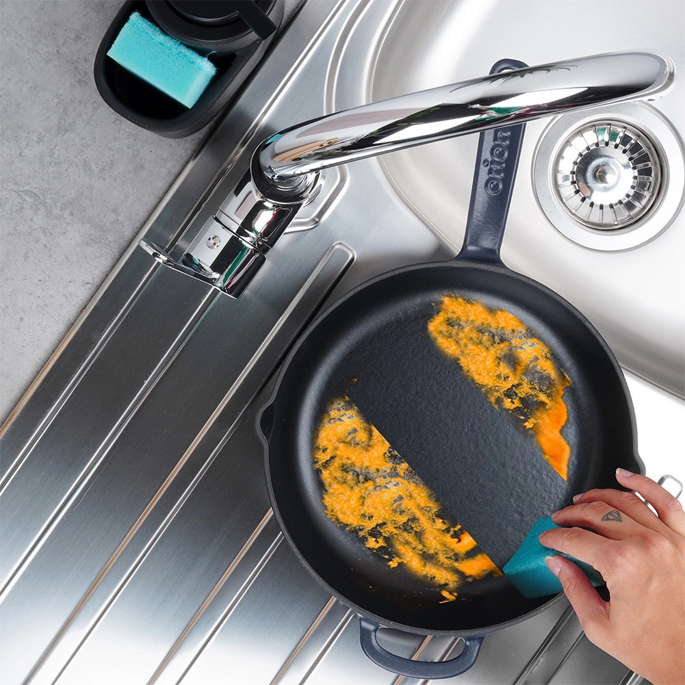 Črna notranja emajlirana površina olajša pripravo jedi in čiščenje, modra zunanjost pa ponvi doda eleganten videz. Primerna tudi za pomivalni stroj (priporočeno ročno pomivanje).