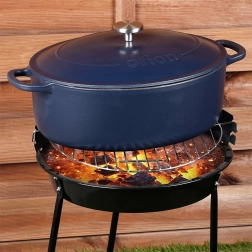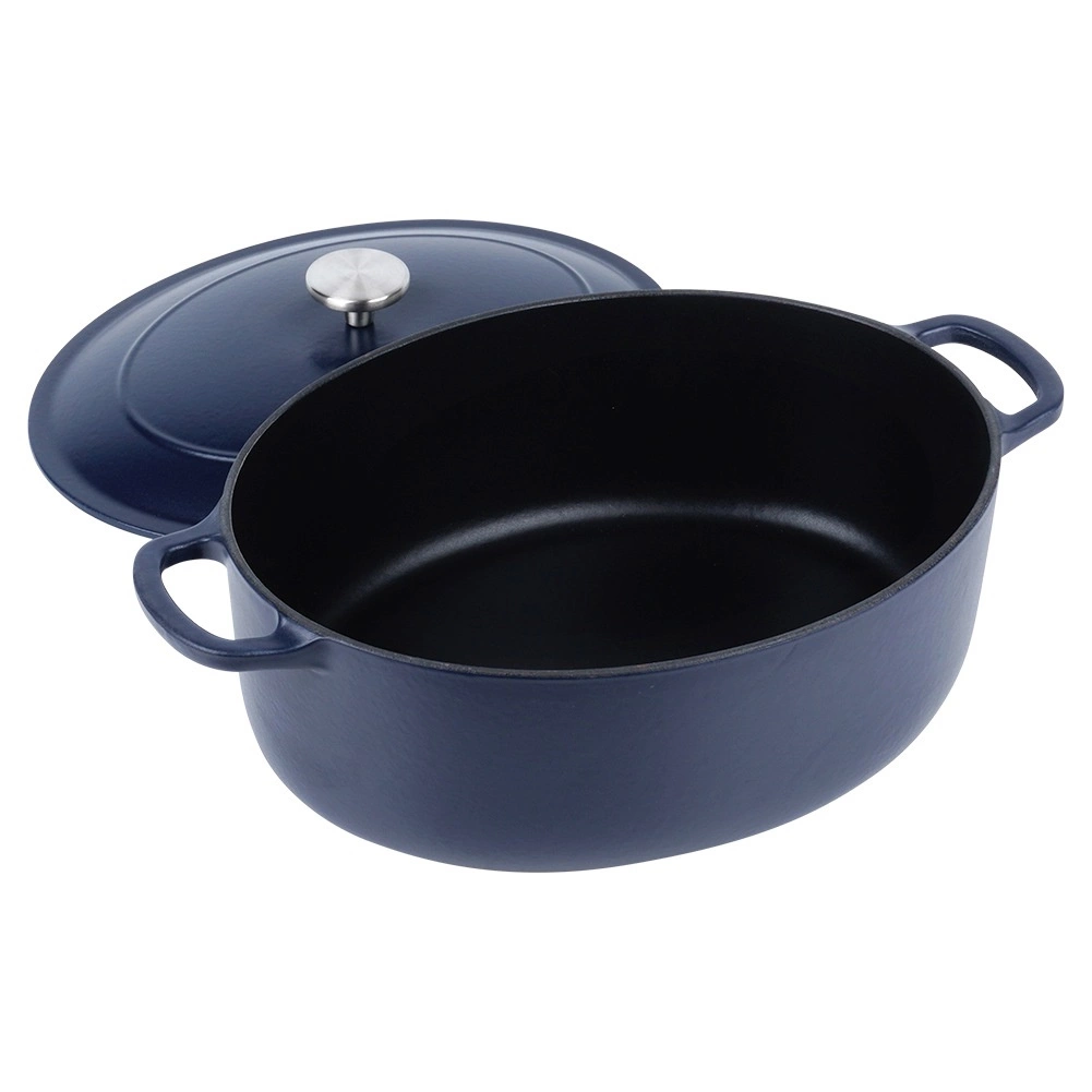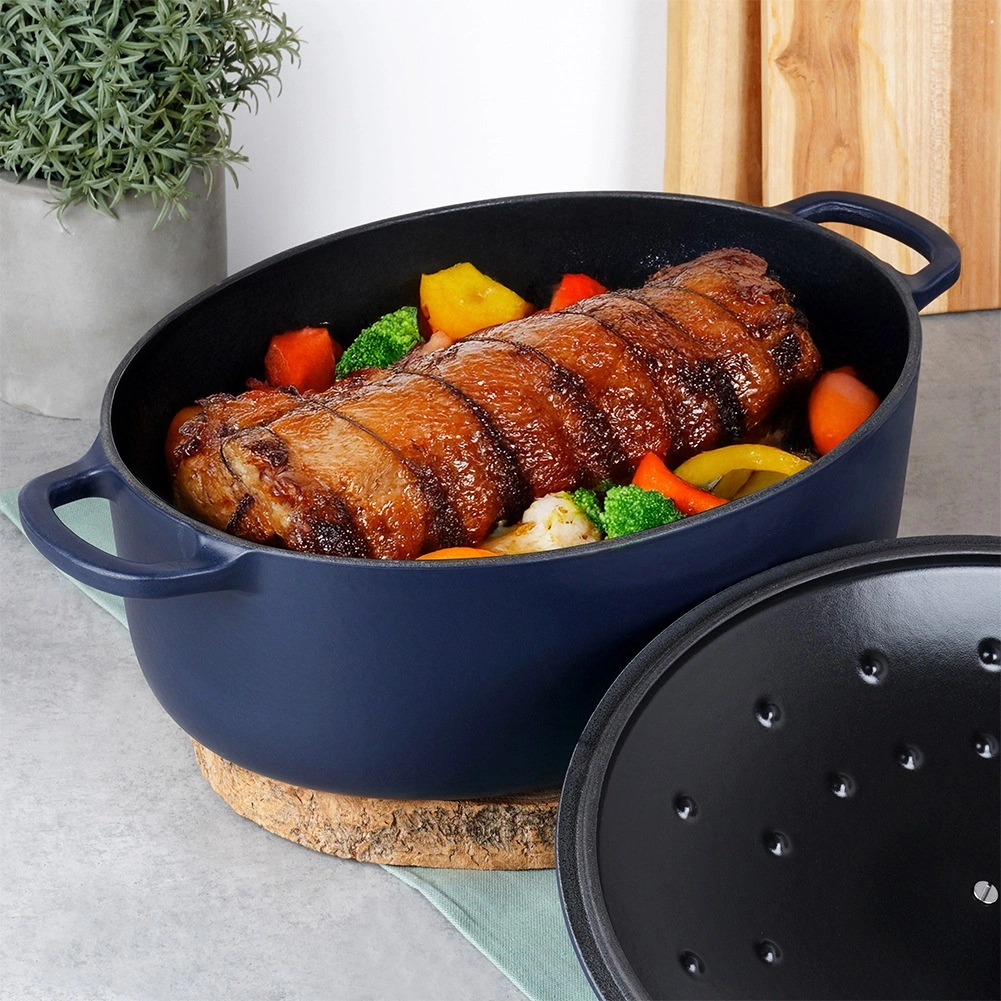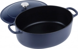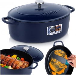 Odkrijte vsestranski ovalni pekač iz kakovostnega emajliranega litoželeza, v katerem pripravite nežne pečenke, sočne raguje in puhasto zapečene jedi. Težko litoželezo se segreva enakomerno in dolgo zadržuje toploto, zato hrana ostane topla tudi pri postrežbi na mizi. Notranji črni emajl olajša cvrtje in sproščanje sokov, zunanji temno moder emajl pa doda pridih elegance vsaki kuhinji.