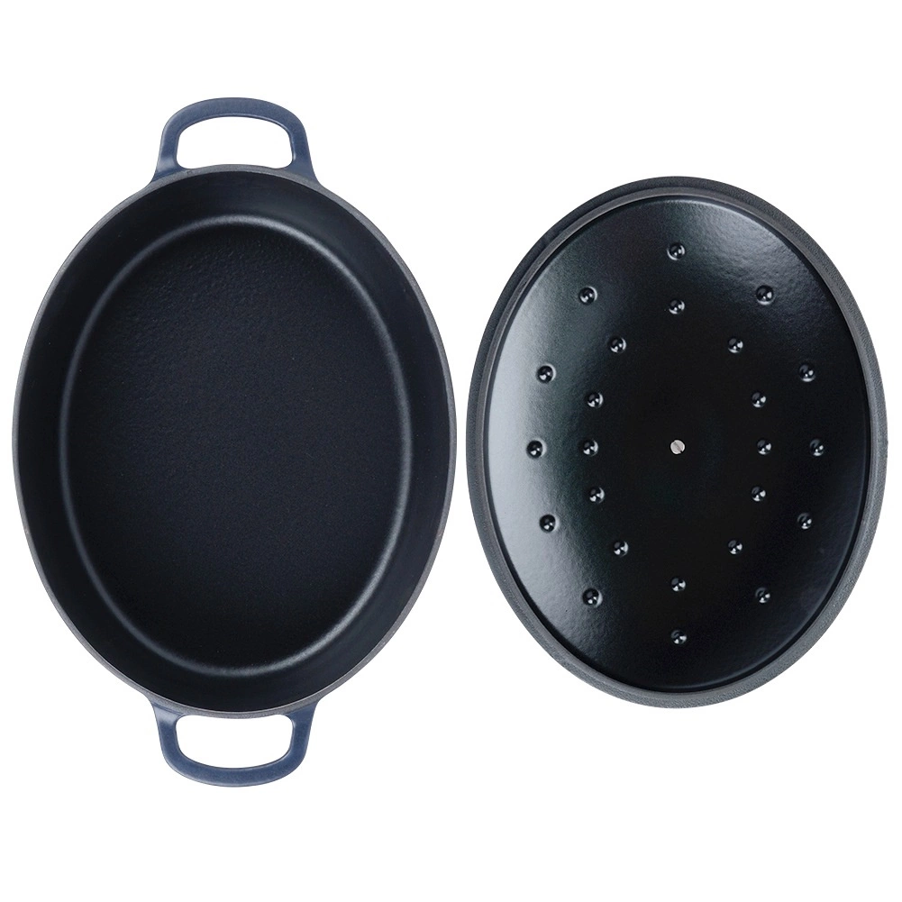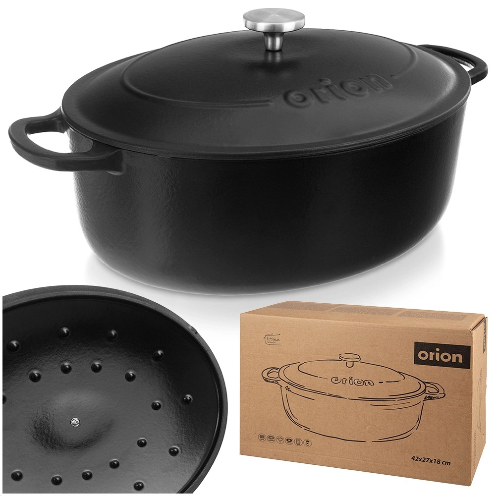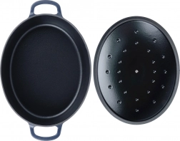 Robusten ovalni pekač iz litoželeza s prostornino 6 l za pečenje, dušenje in cvrtje na štedilniku ali v pečici. Zahvaljujoč emajlirani površini se jedi ne prijemajo, posoda se zlahka čisti, litoželezo pa odlično in enakomerno prevaja toploto. Primerno za vse vrste kuhalnih plošč, vključno z indukcijo, v pečico do 250 °C, z nerjavečim ročajem na pokrovu in širokimi ročaji za varno rokovanje.