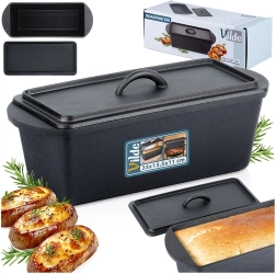 Robusten železni pekač za kruh s pokrovom za popolno domače peko. Litoželezni material odlično akumulira in enakomerno razporeja toploto, je odporen na visoke temperature in primeren za štedilnik, žar in pečico. Prostornina 3 l, mere 35 × 13,5 × 11 cm (brez pokrova), višina s pokrovom 14 cm. Idealen za toast kruh, bábke, pečenke in mesne štruce. Znamka VILDE.