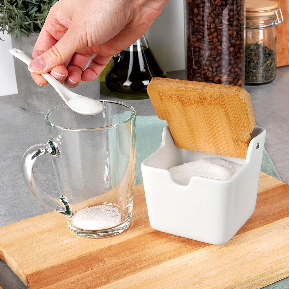Ta kompaktna posodica za sladkor (9,5 × 9,5 × 9 cm) je izdelana iz trpežne bele keramike in dopolnjena z preklopnim bambusovim pokrovčkom, ki ščiti vsebino pred vlago in prahom. Priložena je tudi ujemajoča keramična žlička (13 cm) s priročnim mestom za shranjevanje, tako da je vedno pri roki.