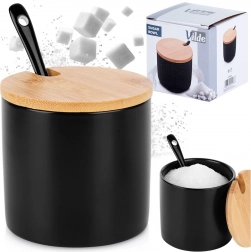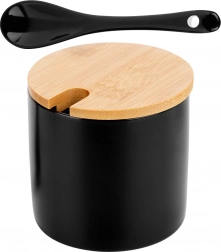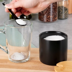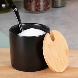 Ta stilska posodica za sladkor združuje kakovostno keramiko v mat črni izvedbi z naravnim bambusovim pokrovčkom. Zahvaljujoč natančnemu izrezu v pokrovčku lahko žličko hranite v notranjosti, zato je vedno pri roki, doziranje pa je maksimalno udobno. Primerna za sladkor, sol in sipke začimbe.