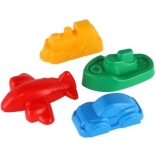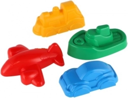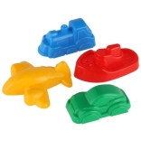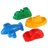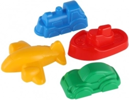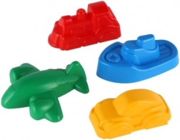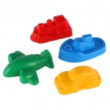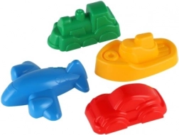 Vlak, ladja, letalo in avto v živahnih barvah spodbujajo otroke k ustvarjanju in igri v pesku ter ob vodi.