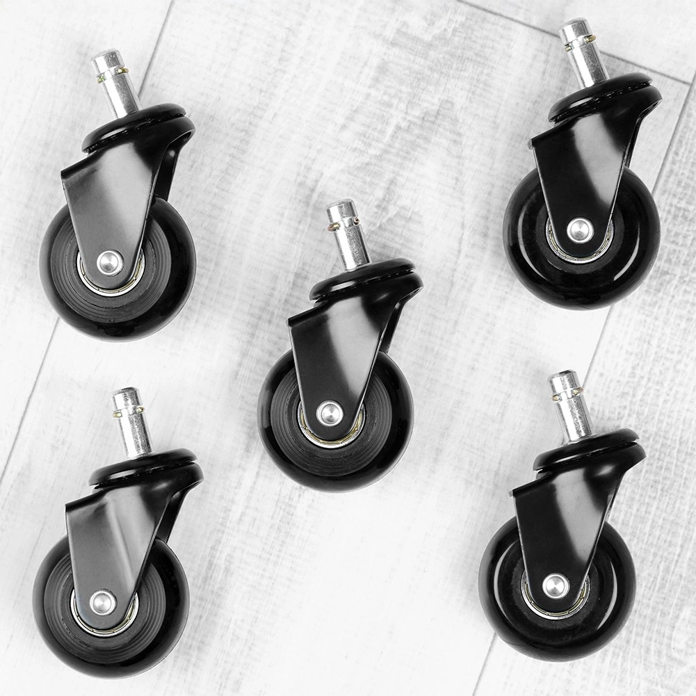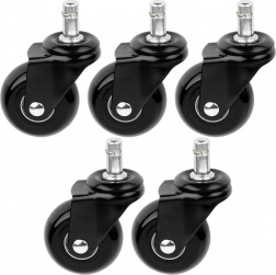 Praktičen set petih nadomestnih kolesc za pisarniški stol prinaša tiho in gladko premikanje po trdih tleh. Gumirana površina zmanjšuje hrup in vibracije ter hkrati ščiti tla pred praskami. Zahvaljujoč premeru kolesca 50 mm in kovinskemu čepu 10 mm se zlahka prilegajo širokemu spektru stolov.