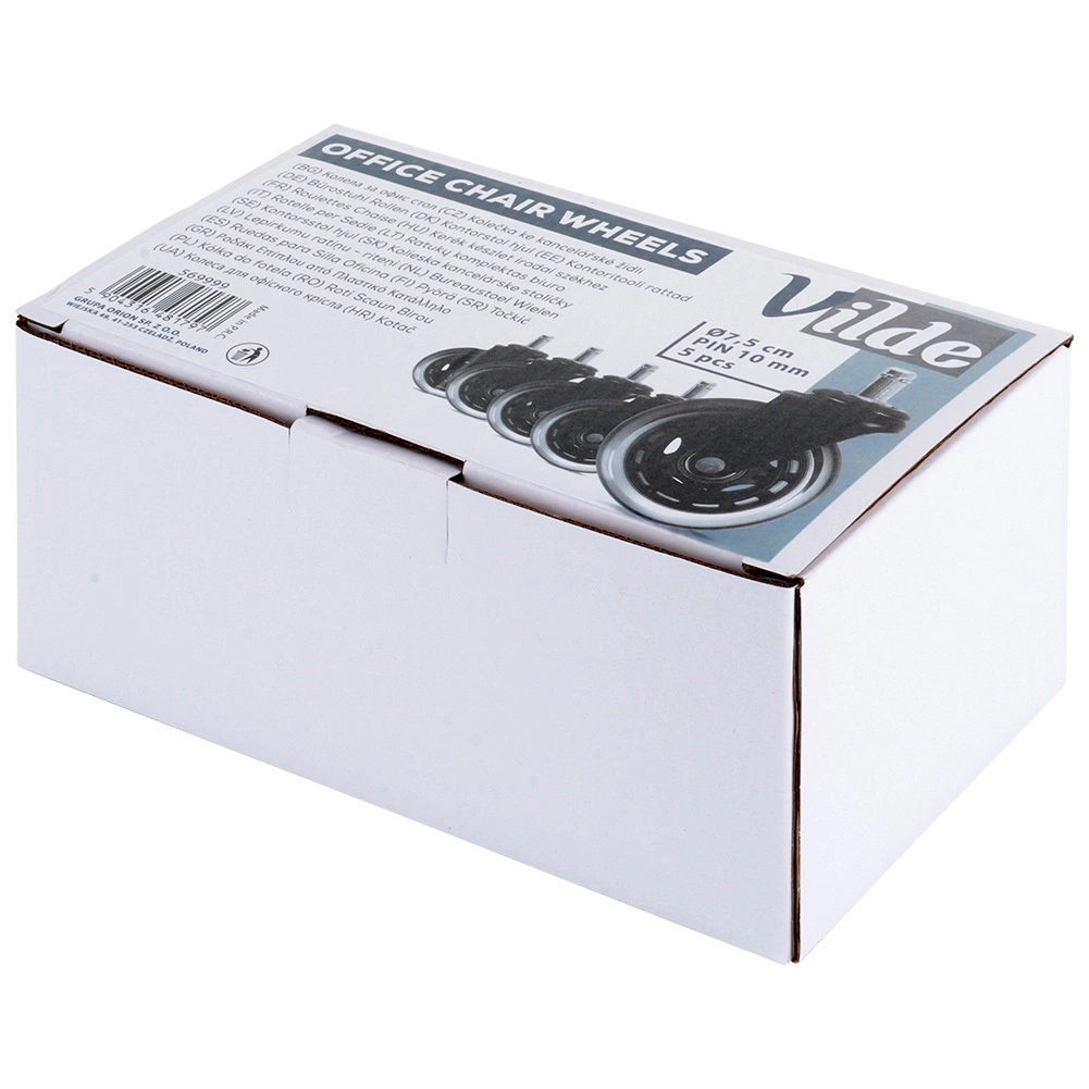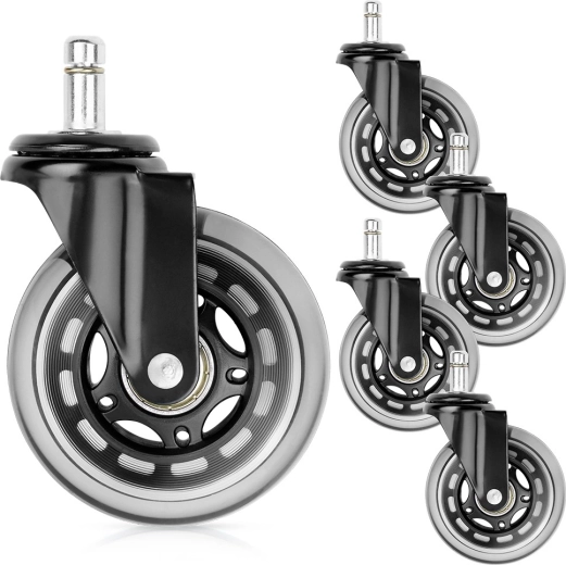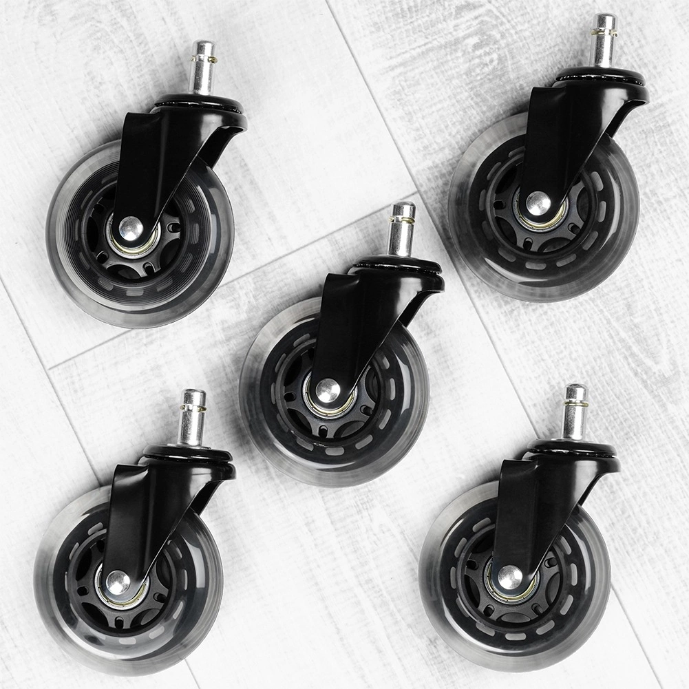 Set petih nadomestnih koles za pisarniške stole prinaša udobno in kultivirano premikanje po trdih tleh. Kolesca iz vzdržljive gume dušijo hrup, varujejo površine in zahvaljujoč kakovostnim ležajem zagotavljajo tekoče vrtenje tudi pri daljši uporabi.