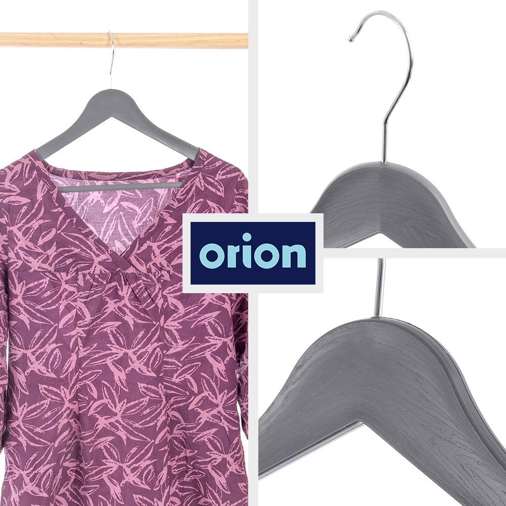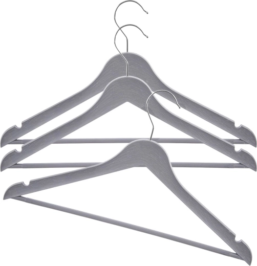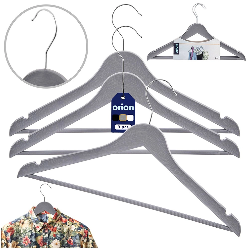 Komplet 3 univerzalnih obešal v moderni sivi barvi pomaga ohraniti omaro popolnoma urejeno. Površina z lesnim dekorjem in kovinski vrtljivi kavelj v srebrni barvi zagotavljata slog in funkcionalnost v enem. Obešala so primerna za vsakodnevno uporabo doma in v oblačilnih trgovinah.