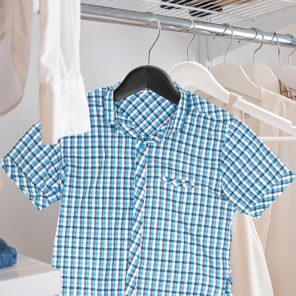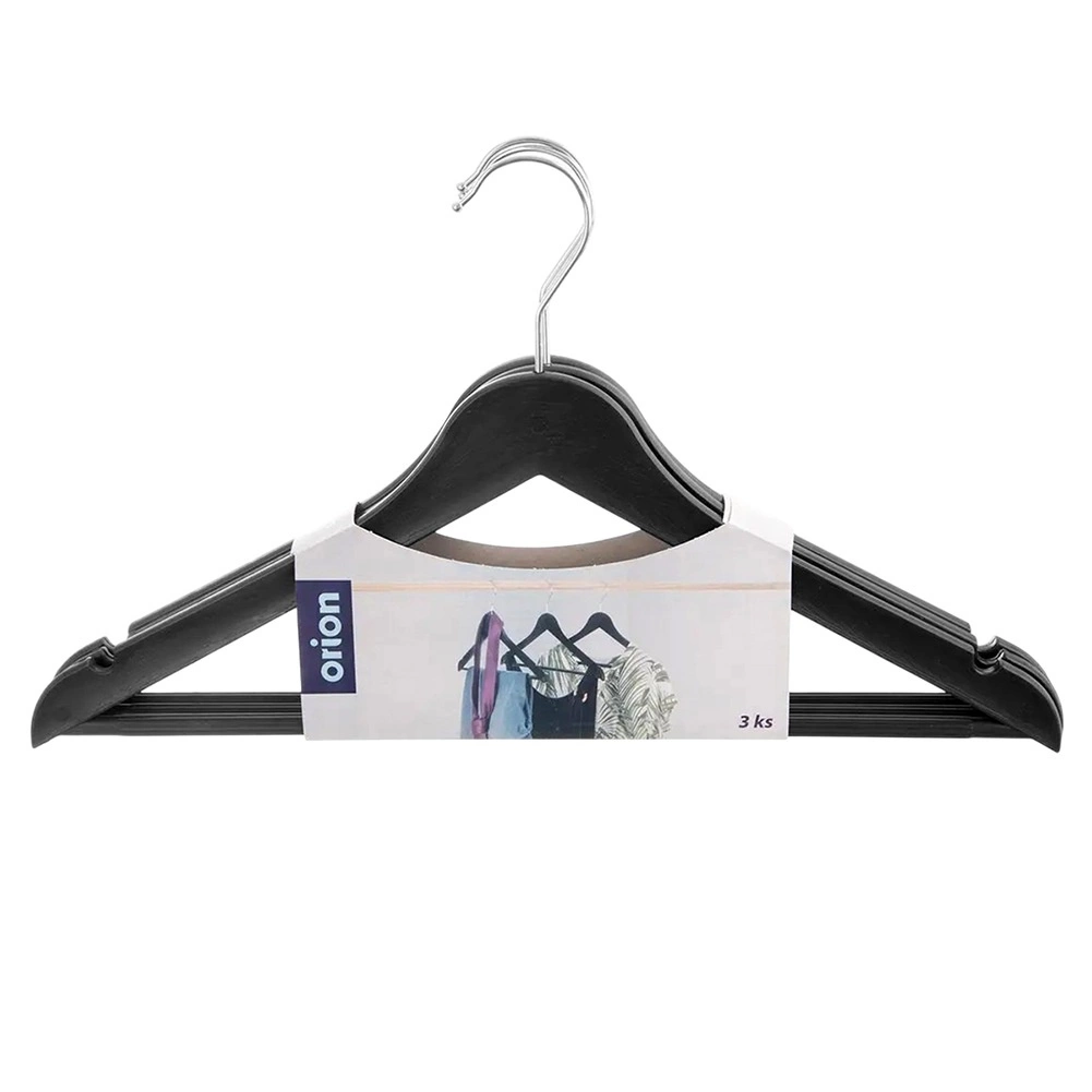 Ohranite garderobo pregledno in brez gub. Ta set 3 črnih obešal z realistično imitacijo lesa ponuja brezčasen dizajn in odporno izvedbo. Vrtljiv kovinski kavelj olajša obešanje iz katere koli smeri, praktične zareze na ramenih pa varno držijo tope s tankimi naramnicami. Spodnja prečka je primerna za hlače, šale ali kravate.