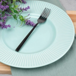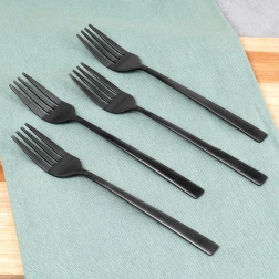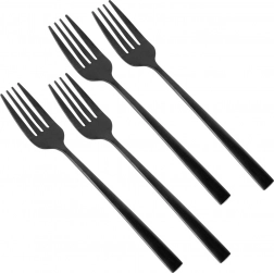 Oplemenitite pogrinjek s stilskimi desertnimi vilicami z mat črnim satenskim zaključkom. Zahvaljujoč kakovostnemu nerjavnemu jeklu so trpežne, zdravstveno neoporečne in dolgoročno ohranjajo svoj eleganten videz. Odlično se ujemajo tako s klasičnimi kot tudi modernimi kompleti posode.