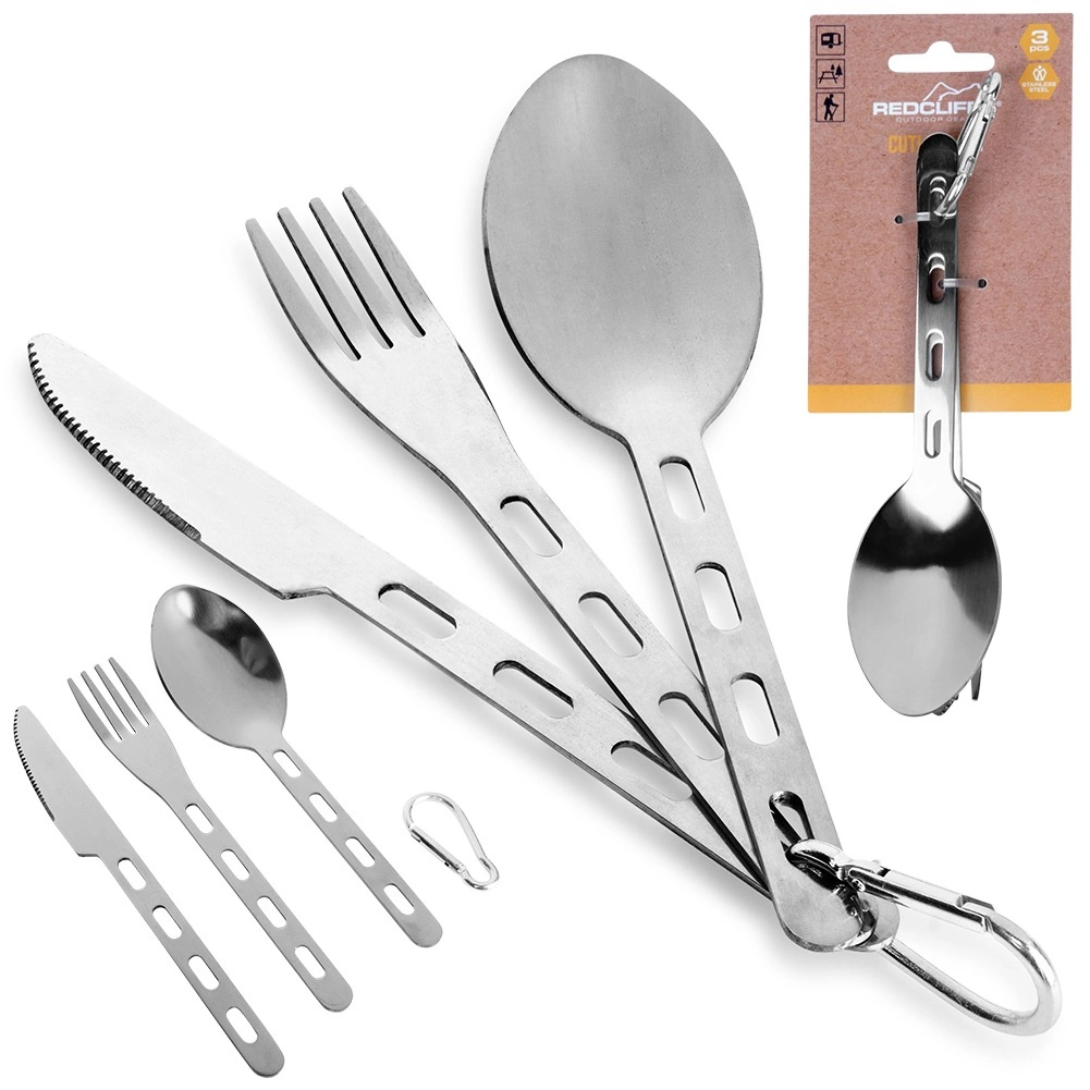 Komplet turističnega pribora je zanesljiv spremljevalec za vsako outdoor avanturo. Zaradi nerjavnega jekla je pribor odporen proti koroziji, trpežen in hkrati enostaven za vzdrževanje. Vse tri dele skupaj drži praktičen karabin, ki olajša obešanje na nahrbtnik ali pas ter prepreči izgubo posameznih kosov.
