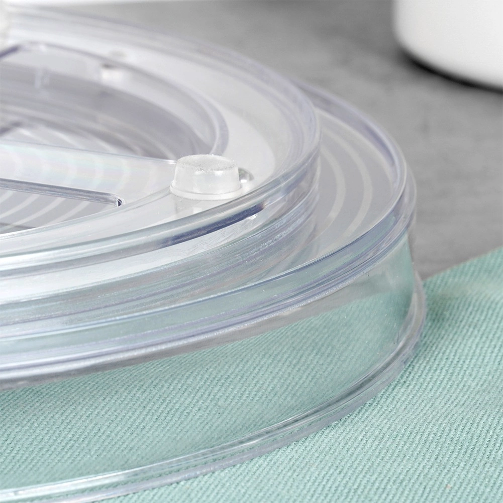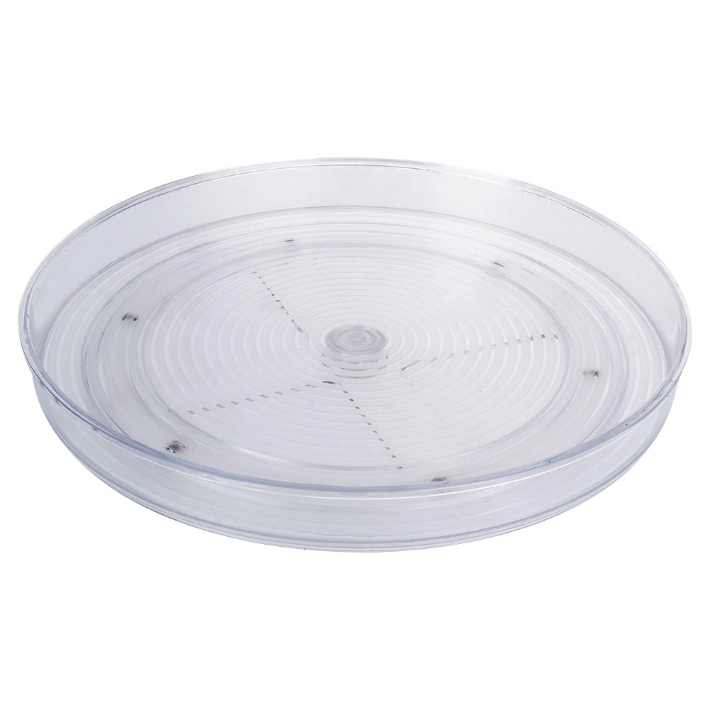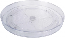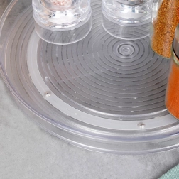 Vrtljiva podloga tipa Lazy Susan pomaga učinkovito organizirati začimbe, kozmetiko, steklenice ali drobnarije v gospodinjstvu. Zahvaljujoč 360° rotaciji preprosto dosežete vse predmete, ne da bi morali prelagati vsebino police ali omare. Prozorna plastika zagotavlja takojšen pregled nad shranjenimi stvarmi.